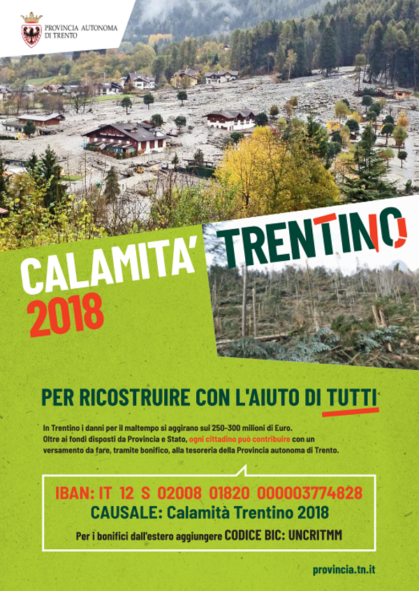 Con la causale "Calamità Trentino 2018" parte la campagna di comunicazione pubblicitaria per sensibilizzare l’opinione pubblica sulla possibilità di fare un versamento volontario sul conto messo a disposizione dall’amministrazione provinciale per raccogliere risorse che saranno impiegate per contribuire a far ripartire il Trentino, dopo i disastri causati dal maltempo.