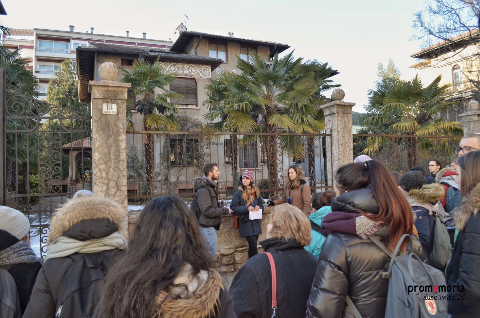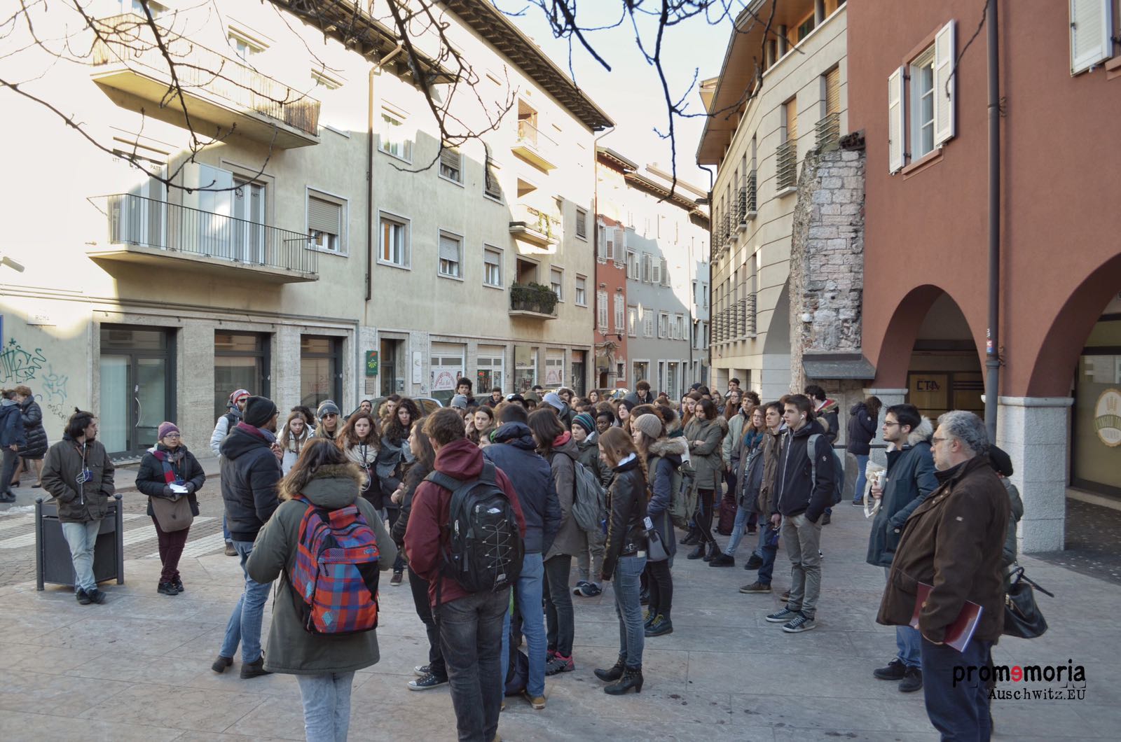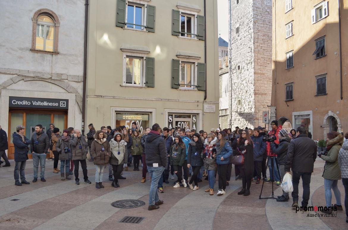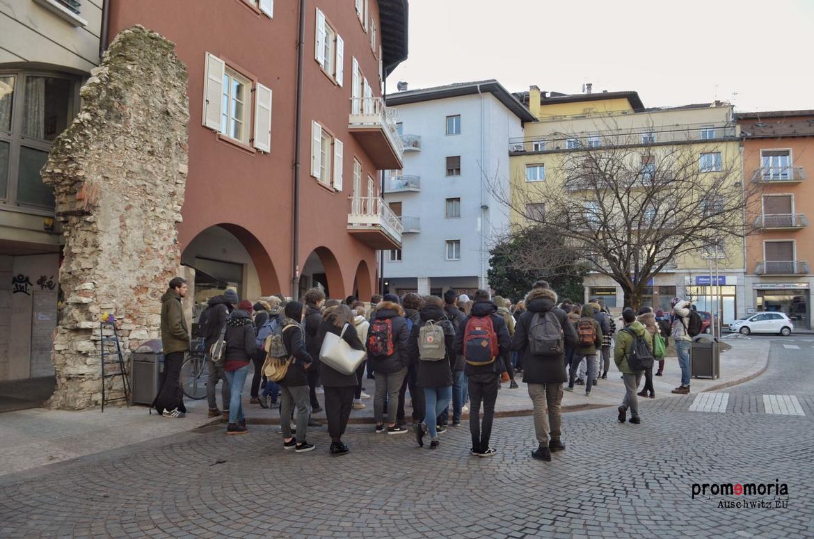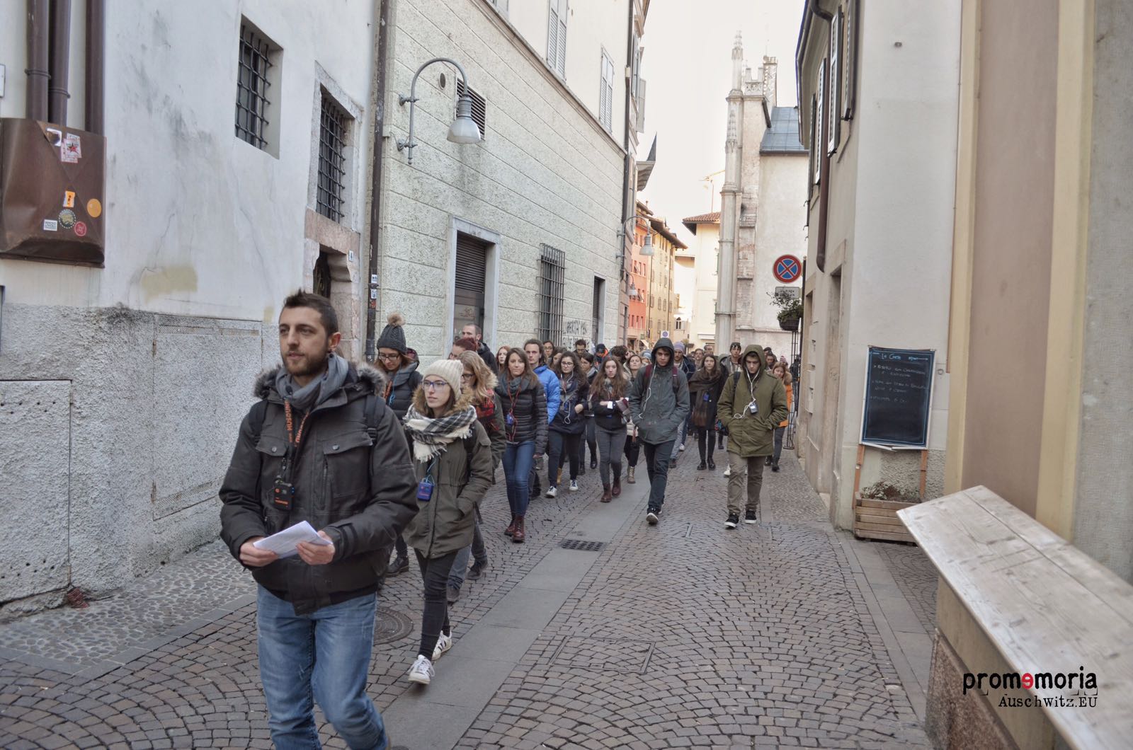 Il percorso del Memowalk ha avuto inizio a Piazza Dante per poi proseguire verso la prima tappa del percorso a la Portela, quartiere del centro città bombardato il 2 settembre 1943 e che causò la morte di circa 200 persone e il danneggiamento di diversi edifici del centro storico. Da qui il cammino è proseguito passando per Piazza Duomo e Piazza Pasi. La tappa ha permesso di ricordare Mario Pasi, medico e partigiano italiano, medaglia d'oro al valor militare alla memoria. Continuando il percorso il gruppo è passato davanti a Torre Littoria, ex casa del Fascio, in Piazza Venezia per concludere il viaggio nei luoghi della memoria della Città di Trento a Villa Triste, ex sede della Gestapo dove frequenti furono gli interrogatori e le torture e il carcere di via Pilati, dove venivano rinchiusi i prigionieri prima di essere deportati. (gz)