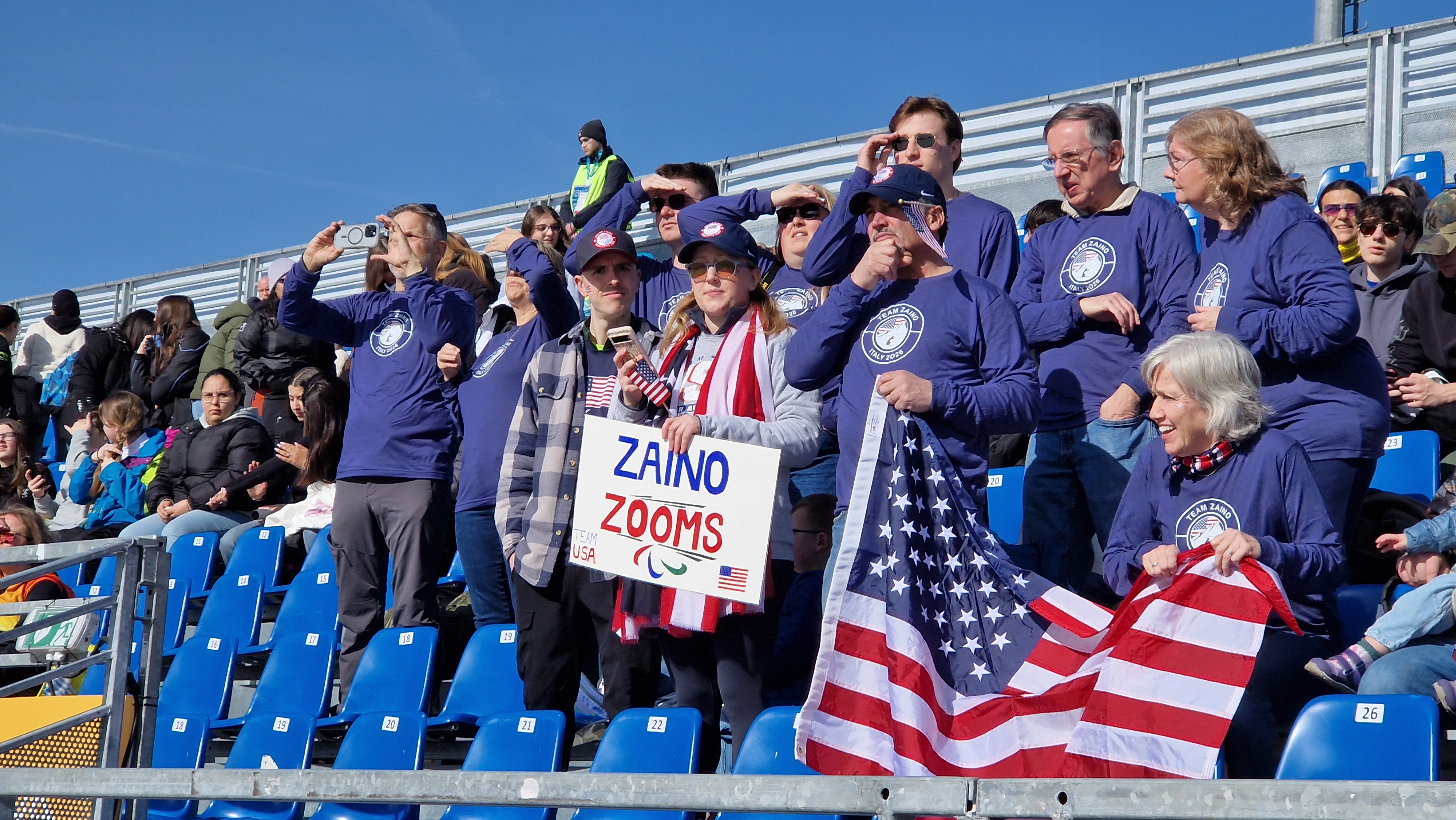 Non sono i numeri delle Olimpiadi ma colori, passione ed entusiasmo sono gli stessi. Lo conferma un gruppo di tifosi venuti in Val di Fiemme direttamente da Brookfield – città ubicata nello stato Usa del Connecticut - per seguire da vicino Nicole Zaino, impegnata nella categoria sitting del parabiathlon. "It's great – affermano in coro – ogni cosa è al suo posto, non abbiamo notato difetti. C'è anche un gran sole caldo che per gli spettatori è una manna, per la neve e gli atleti forse meno ma siamo sicuri che lo spettacolo non mancherà. Alloggiamo a Cavalese e seguiremo Nicole per tutta la durata delle Paralimpiadi. Sarà in gara anche nelle prove di sci di fondo e noi saremo accanto a lei fino a domenica".