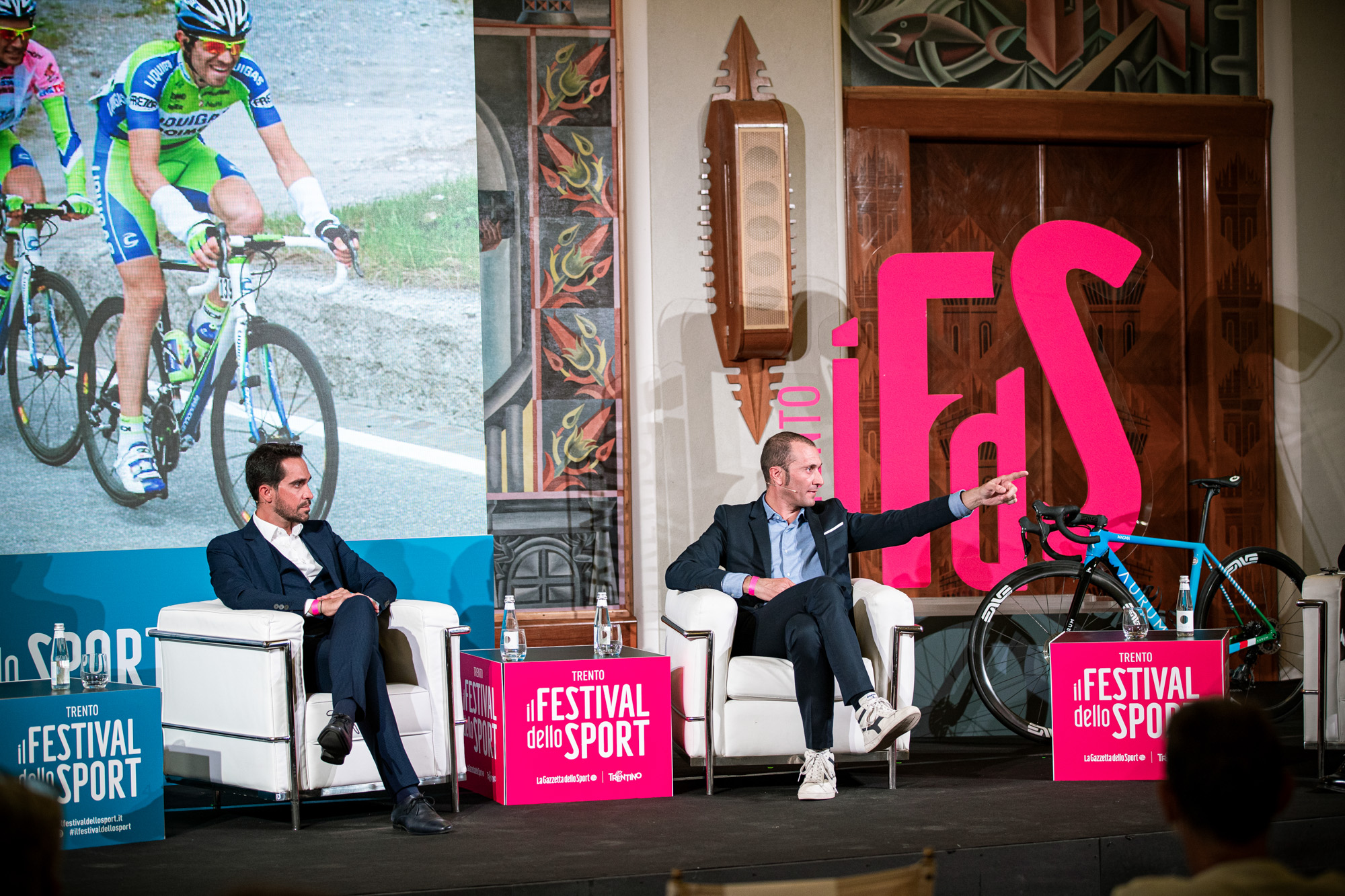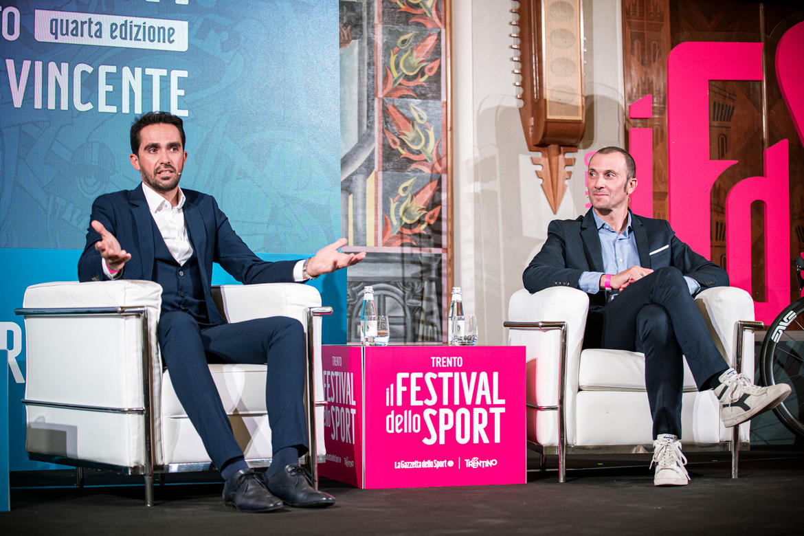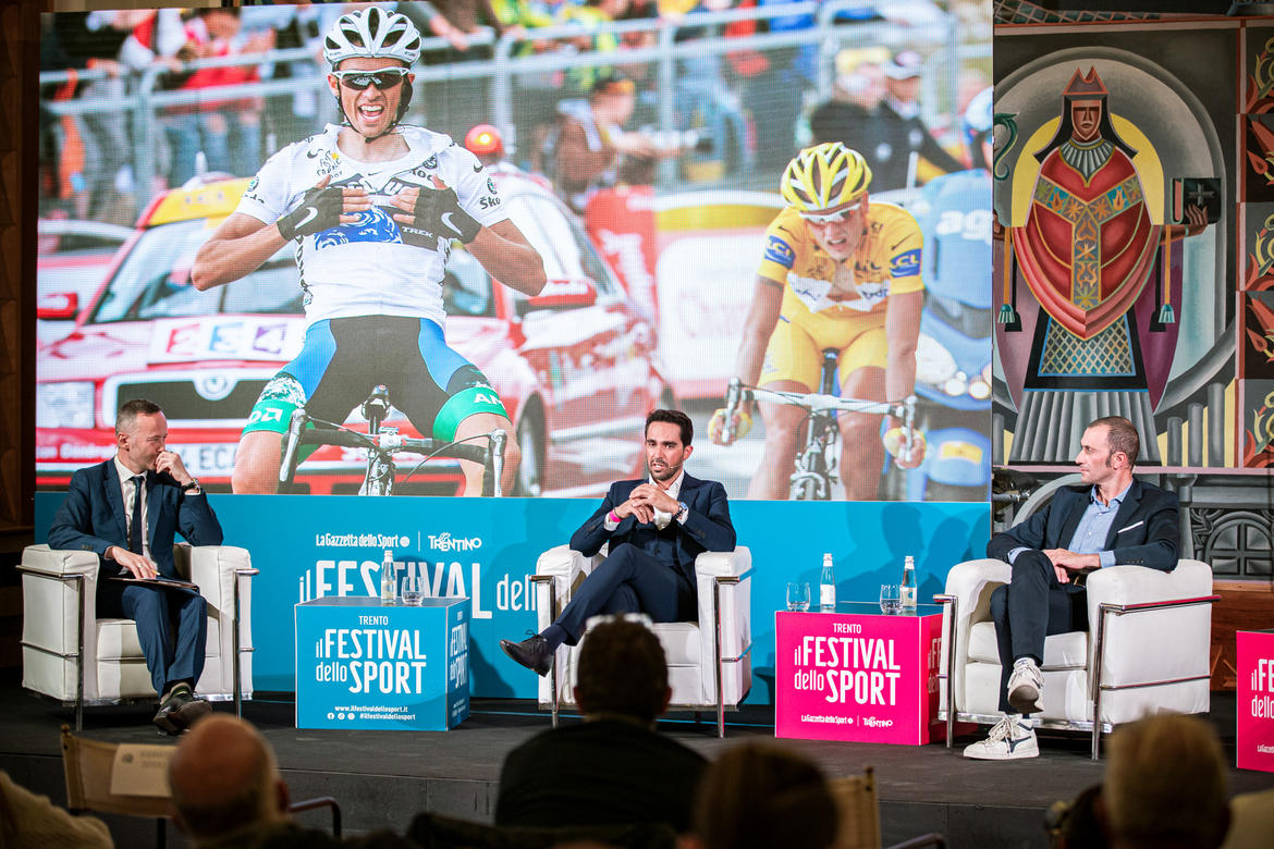 “Due uomini soli al comando” è il titolo scelto per l’incontro che si è aperto con il racconto di come è nato il grande rapporto di Contador con l’Italia. Il Trentino, ha ricordato Faustini, è una terra che ha dato molto al ciclismo, sport che è di squadra ma che esalta anche le grandi individualità. Ed è forte anche il legame tra Ivan Basso e il Trentino, visto che da allievo, il campione ha vinto la Coppa d’Oro.
