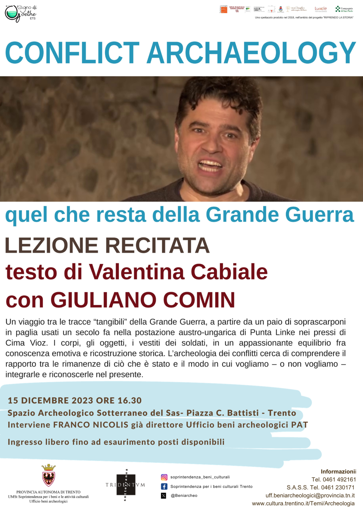 L’archeologia della Grande Guerra è una disciplina relativamente nuova e innovativa nel panorama italiano. Da alcuni anni il ritiro e lo scioglimento dei ghiacciai del Trentino causati dall’emergenza climatica, hanno portato gli archeologi su quello che era il fronte più alto della Prima guerra mondiale a oltre 3000 metri di altitudine. Gli interventi, condotti con metodo archeologico da équipe multidisciplinari composte da archeologi, geologi, guide alpine, restauratori, hanno riguardato il recupero di strutture, come la teleferica riemersa dai ghiacci di Punta Linke, e di oggetti, ma anche e soprattutto di resti di soldati affiorati dal ghiaccio e rinvenuti casualmente da escursionisti alle alte quote del ghiacciaio del Presena e alle pendici occidentali del Corno di Cavento nel Gruppo dell'Adamello. Un compito non facile e delicato per restituire alla memoria collettiva tasselli di storia e di micro-storie e per rendere omaggio a chi è stato suo malgrado protagonista di questi tragici eventi.