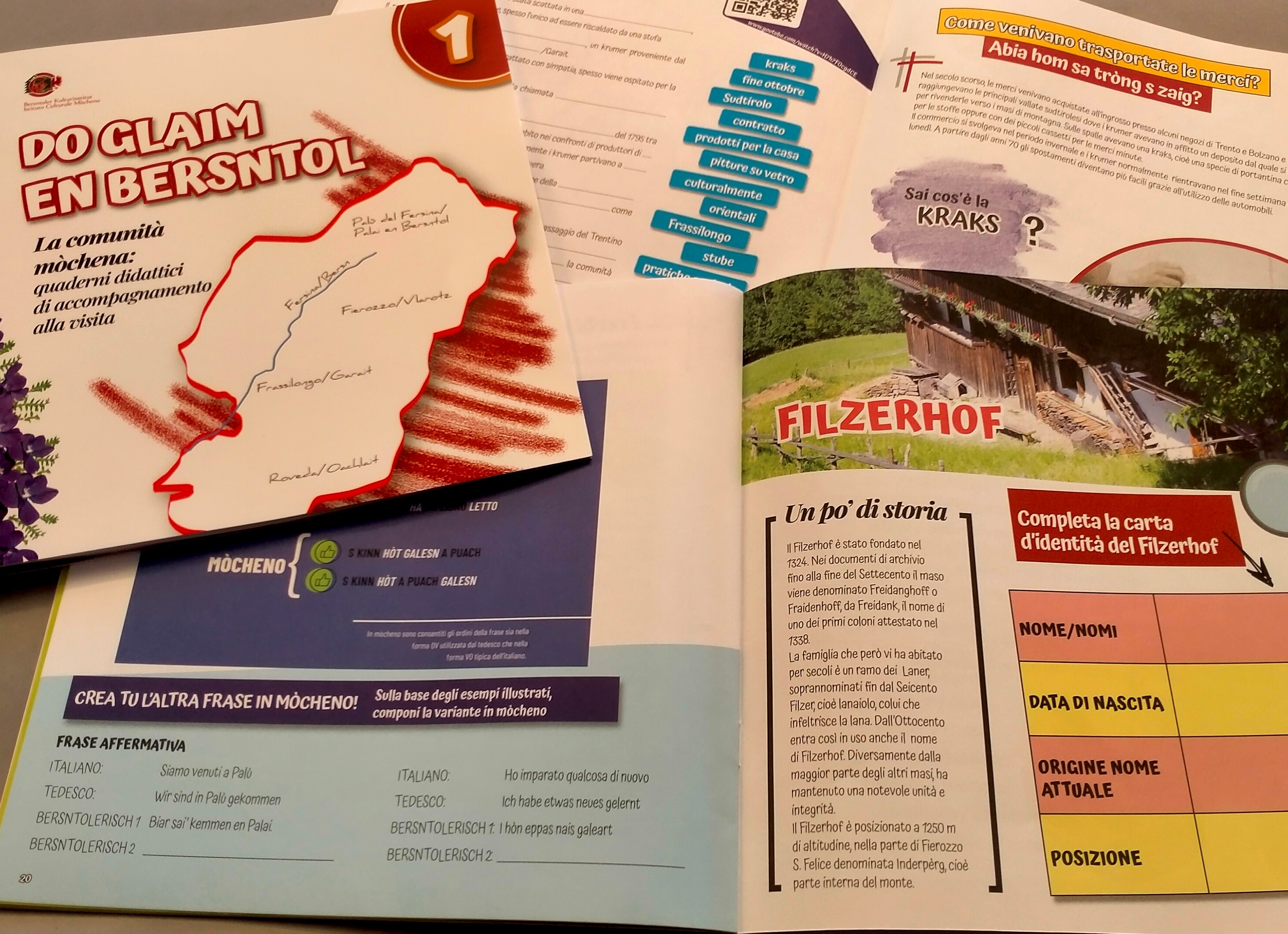 Seguendo il quaderno didattico appositamente realizzato per gli alunni ”Do glaim en Bersntol”, le prime classi hanno preso conoscenza con l’origine medievale della comunità, con le tradizionali attività di stampo agricolo-pastorale e in particolare, tramite la visita guidata alla segheria Sog van Rindel, dell’utilizzo del bosco e delle varie essenze legnose. Le seconde classi hanno approfondito la tematica linguistica con la visita alla mostra “Klòffen, sprechen, parlare, attraverso la lingua mòchena”. Tramite il paragone con la lingua tedesca, gli alunni si sono cimentati con elementi quali il contatto linguistico, la toponomastica e naturalmente i fondamenti della grammatica mòchena. A seguire, la visita al Filzerhof, il maso museo, ha consentito di conoscere ulteriori elementi sia della vita famigliare che di quella comunitaria. Le terze hanno approfondito due altre tematiche fondamentali per la storia e la vita dei paesi mòcheni: il commercio ambulante stagionale praticato dalla fine del Settecento e l’attività mineraria. Quest’ultimo aspetto si è completato con la visita allo Perkmandlhaus, il piccolo museo minerario e alla Gruab va Hardimbl, la miniera medievale visitabile a piccoli gruppi e dalle scuole nella zona sottostante al Lago di Erdemolo, a 1700 metri di quota.