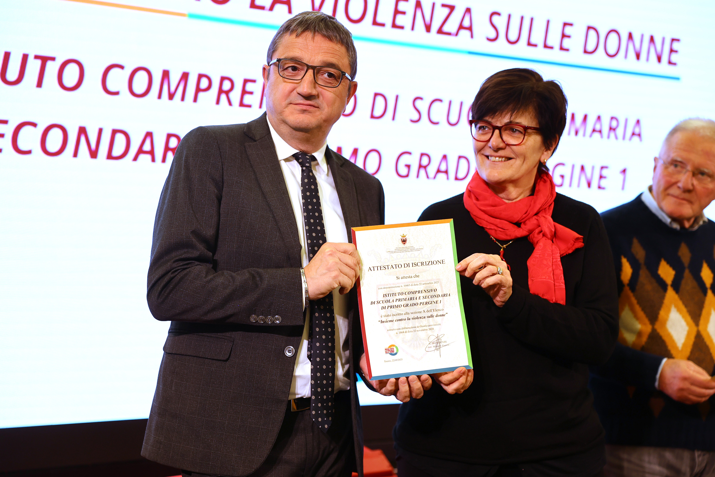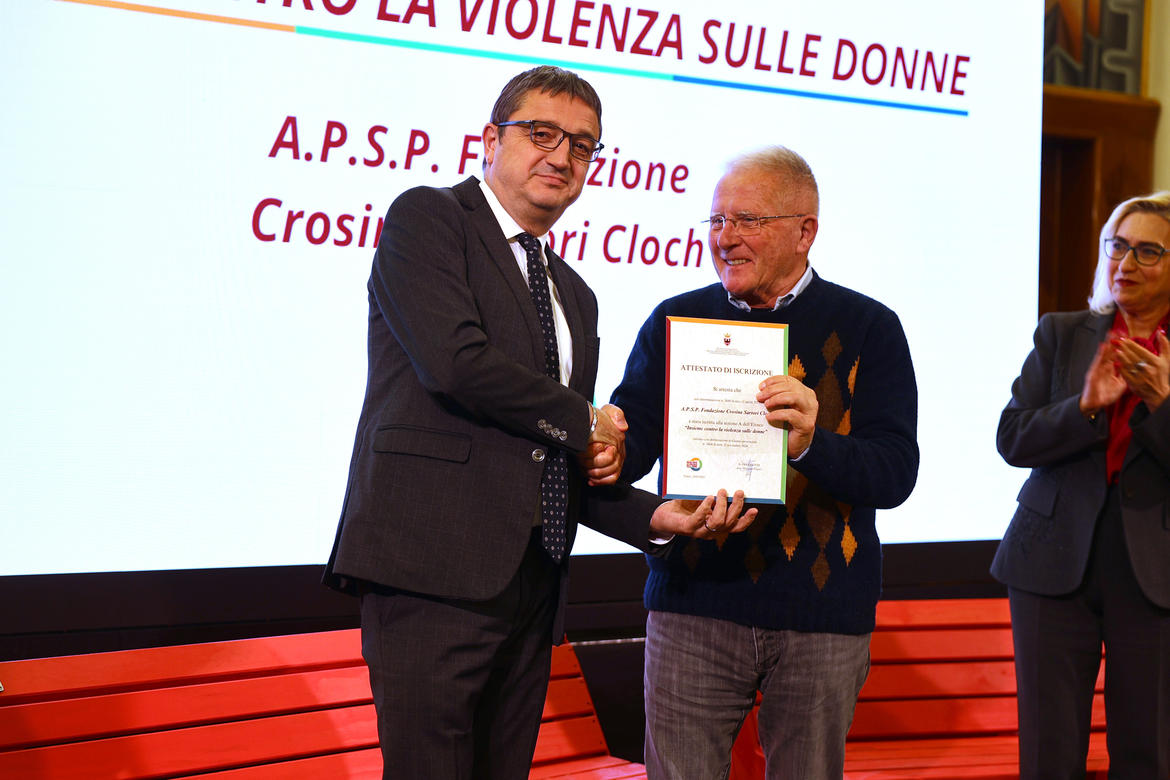 Particolarmente significativa la cerimonia di consegna degli attestati di iscrizione all’elenco “Insieme contro la violenza”, un nuovo strumento istituito dall'amministrazione provinciale lo scorso anno per promuovere e coordinare le iniziative a favore delle donne vittime di violenza di genere sul territorio provinciale, che sono stati assegnati dal presidente Fugatti a: Claudia Segre, presidente della Global Thinking Foundation; Giorgio Casagranda, vice presidente della Fondazione Crosina Sartori Cloch; Daniela Fruet, dirigente dell'Istituto Comprensivo Pergine 1.