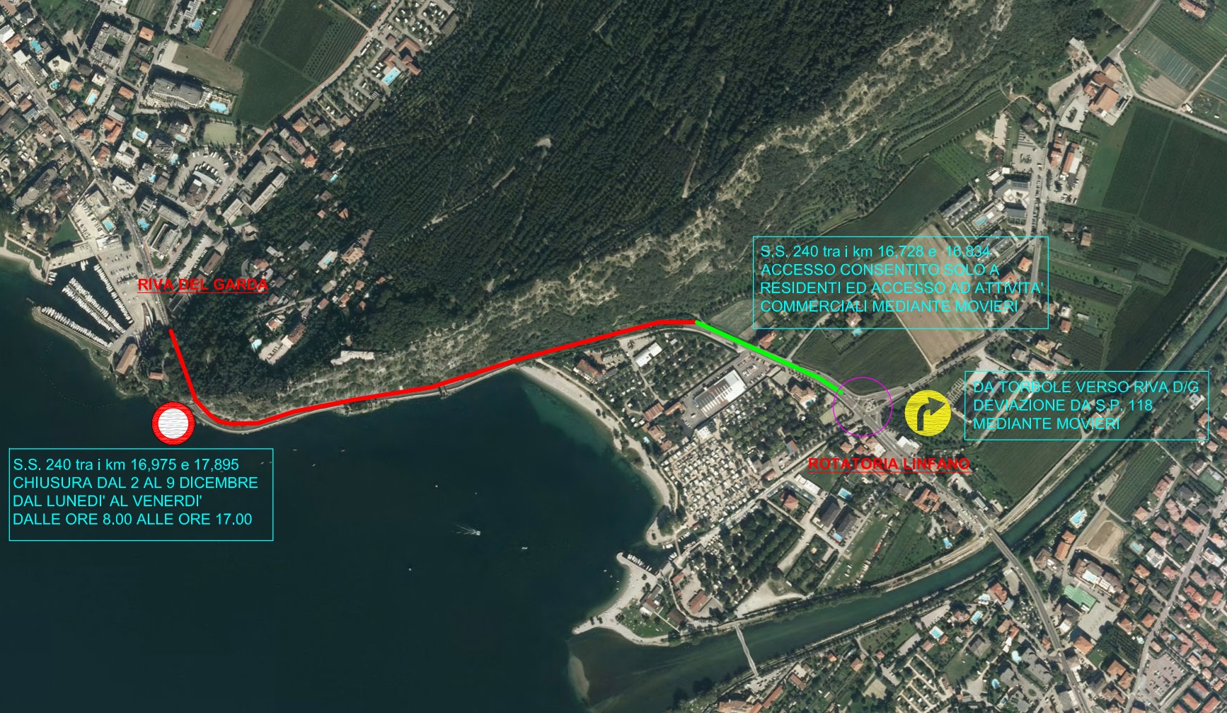 * Chiusura in entrambi i sensi di marcia del tratto della S.S. 240 tra Lido di Arco e Porto San Nicolò. Il traffico sarà deviato su Via Monte Brione e sulle strade provinciali Sp 118 e Ss 249.