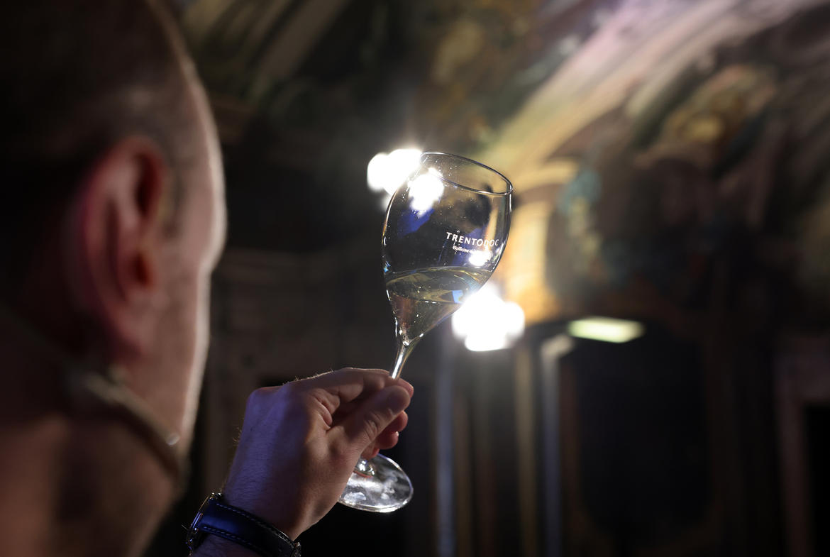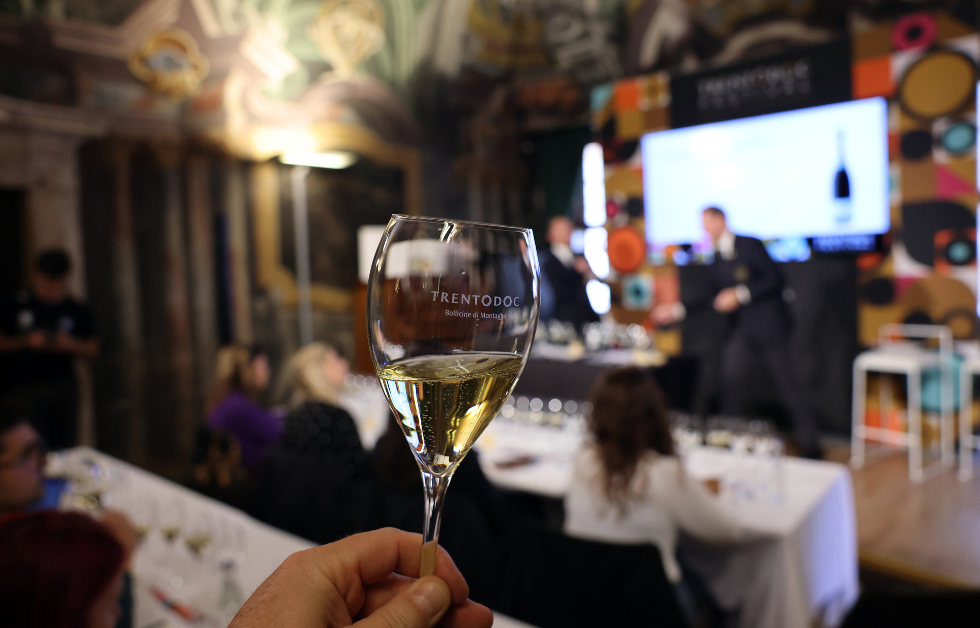 Come di consueto, nei “Trentodoc tasting” dopo la teoria si passa alla pratica, con sei calici che raccontano concretamente quanto detto sin qui. Si inizia con il Trentodoc 100% Chardonnay, 30 mesi sui lieviti: al naso profuma di tiglio, mela golden, pera Williams e una lieve sensazione di erbe aromatiche, mentre al sorso è salino, schietto, essenziale. Il secondo calice ci porta in valle di Cembra con un Trentodoc 100% Chardonnay, 50 mesi sui lieviti: gusto fragrante e complesso, con note floreali e di frutta gialla matura, ma anche leggere note di nocciola e pane tostato, al sorso è compatto, profondo, ritmato, fresco, limonato e sapido.