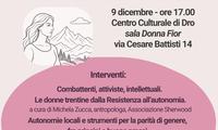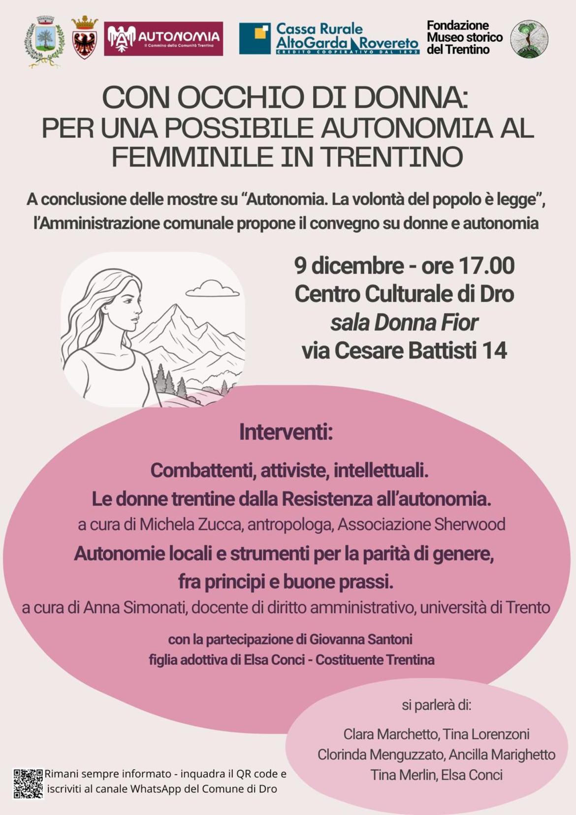 Il convegno "Con occhio di donna" vedrà gli interventi di Michela Zucca, antropologa dell’Associazione Sherwood, con un contributo su “Combattenti, attiviste, intellettuali. Le donne trentine dalla Resistenza all’autonomia”, e di Anna Simonati, docente di diritto amministrativo dell’Università di Trento, che porterà una riflessione su “Autonomie locali e strumenti per la parità di genere, fra principi e buone prassi”. Sarà presente anche Giovanna Santoni, figlia adottiva di Elsa Conci, testimone e protagonista della storia autonomistica trentina. Nel corso del pomeriggio verranno ricordate figure come Clara Marchetto, Tina Lorenzoni, Clorinda Menguzzato, Ancilla Marighetto, Tina Merlin ed Elsa Conci, donne che hanno contribuito in modo significativo alla crescita civile e politica del territorio.