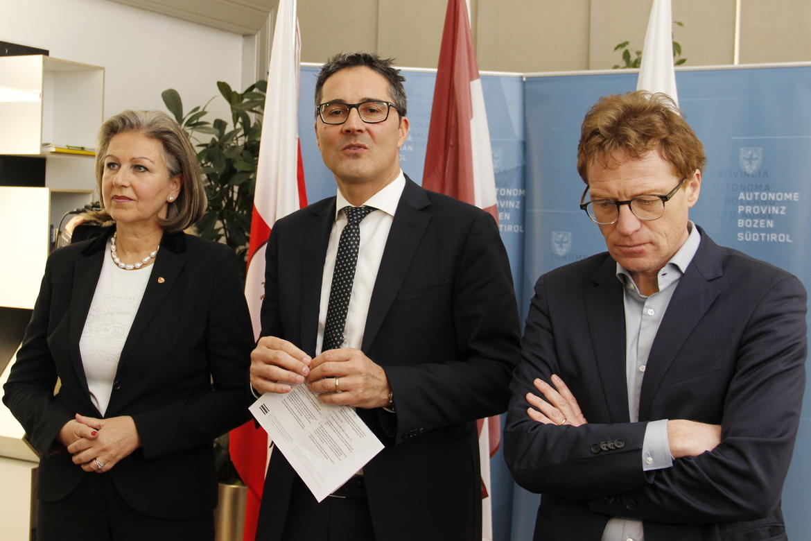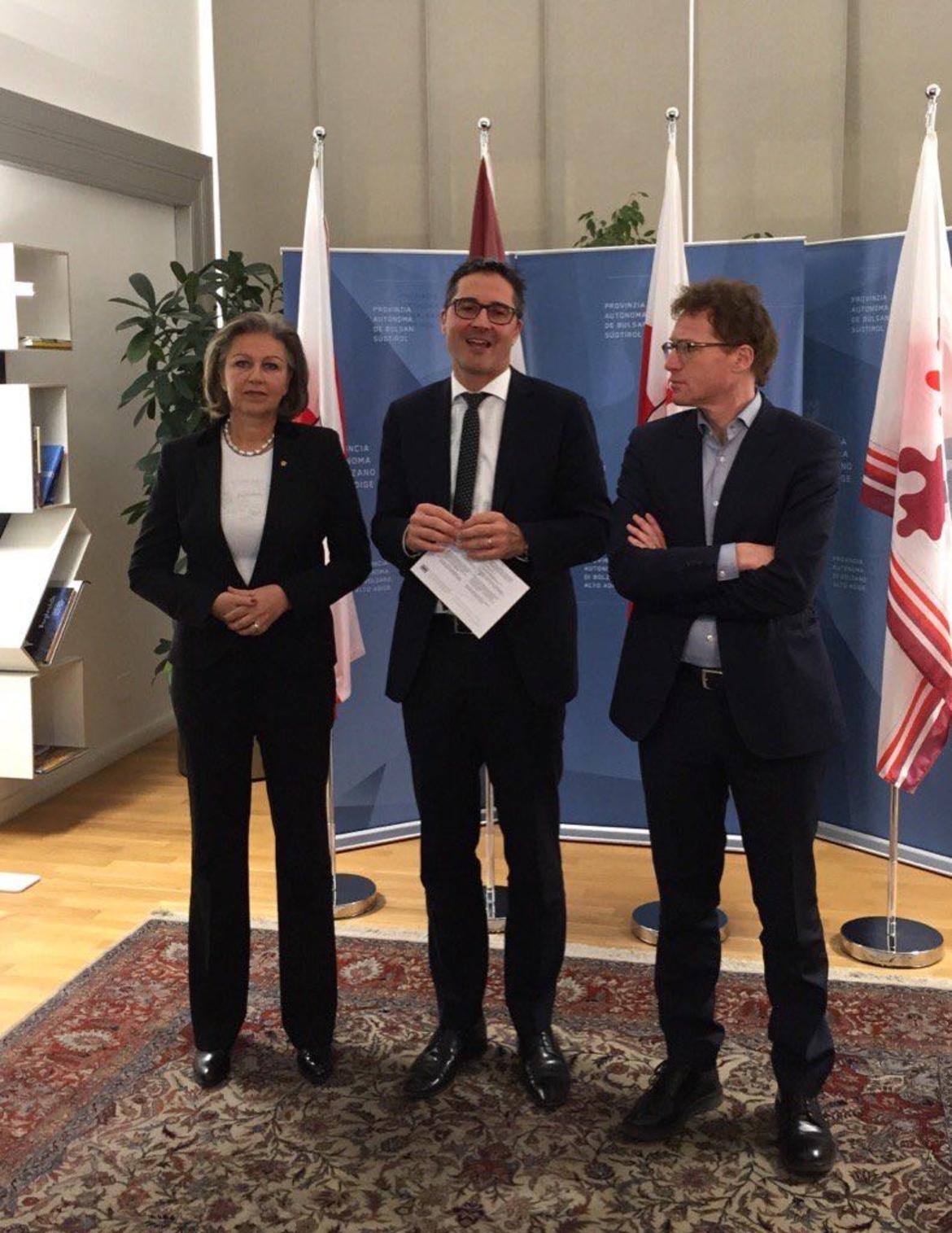 Cooperazione transfrontaliera, marketing territoriale, sinergie per sfruttare al meglio i finanziamenti europei. Questi i temi al centro dell'incontro di questa mattina a Bolzano, a Palazzo Widmann, fra il presidente della Provincia di Bolzano, nonché assessore all'economia, Arno Kompatscher, e i due assessori all'economia di Tirolo e del Trentino, Patrizia Zoller-Frischauf e Alessandro Olivi. In Tirolo, Alto Adige e Trentino Standortagentur Tirol, IDM e Trentino Sviluppo offrono già oggi servizi su misura e infrastrutture che promuovono le imprese start-up e gli spin-off, a beneficio del tessuto economico dei singoli territori. Con l'incontro di oggi si è deciso di dare il via ad una nuova sinergia. A partire da febbraio 2017 le tre organizzazioni accorperanno le proprie offerte attuali e promuoveranno la nascita di un vero e proprio sito economico a livello euroregionale.