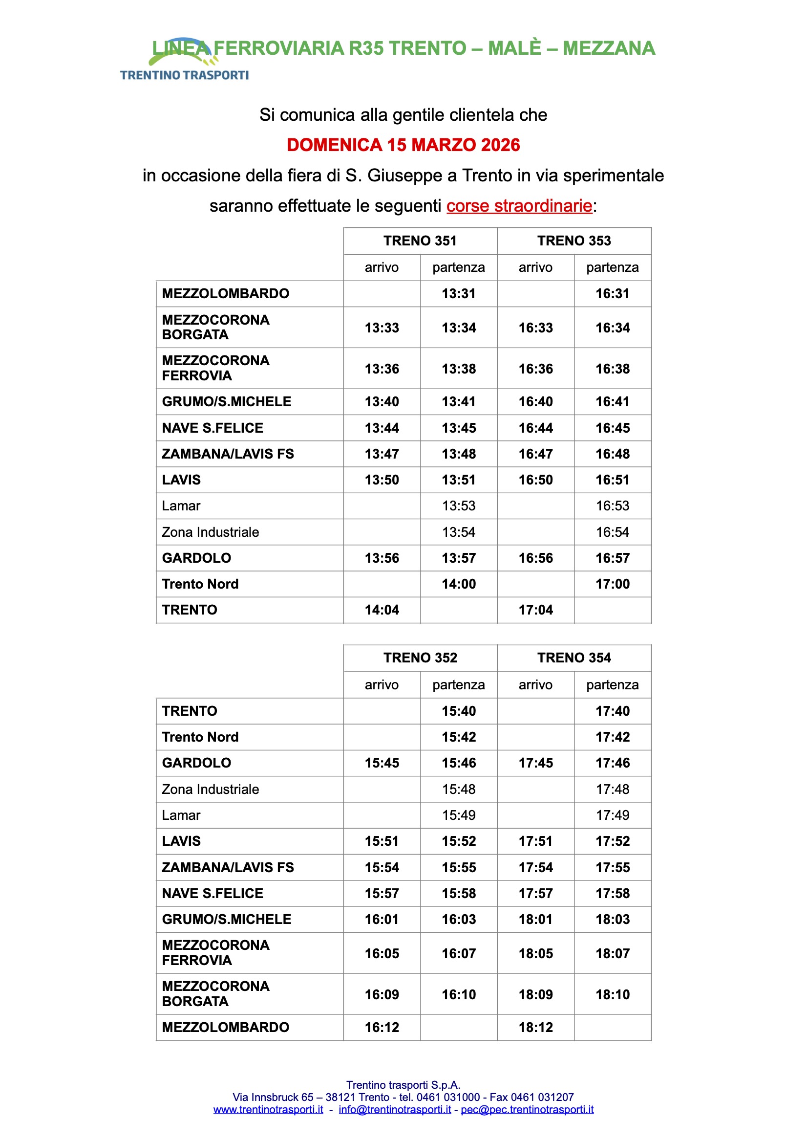 Fiera di San Giuseppe, corse aggiuntive della Trento-Malé da Mezzolombardo