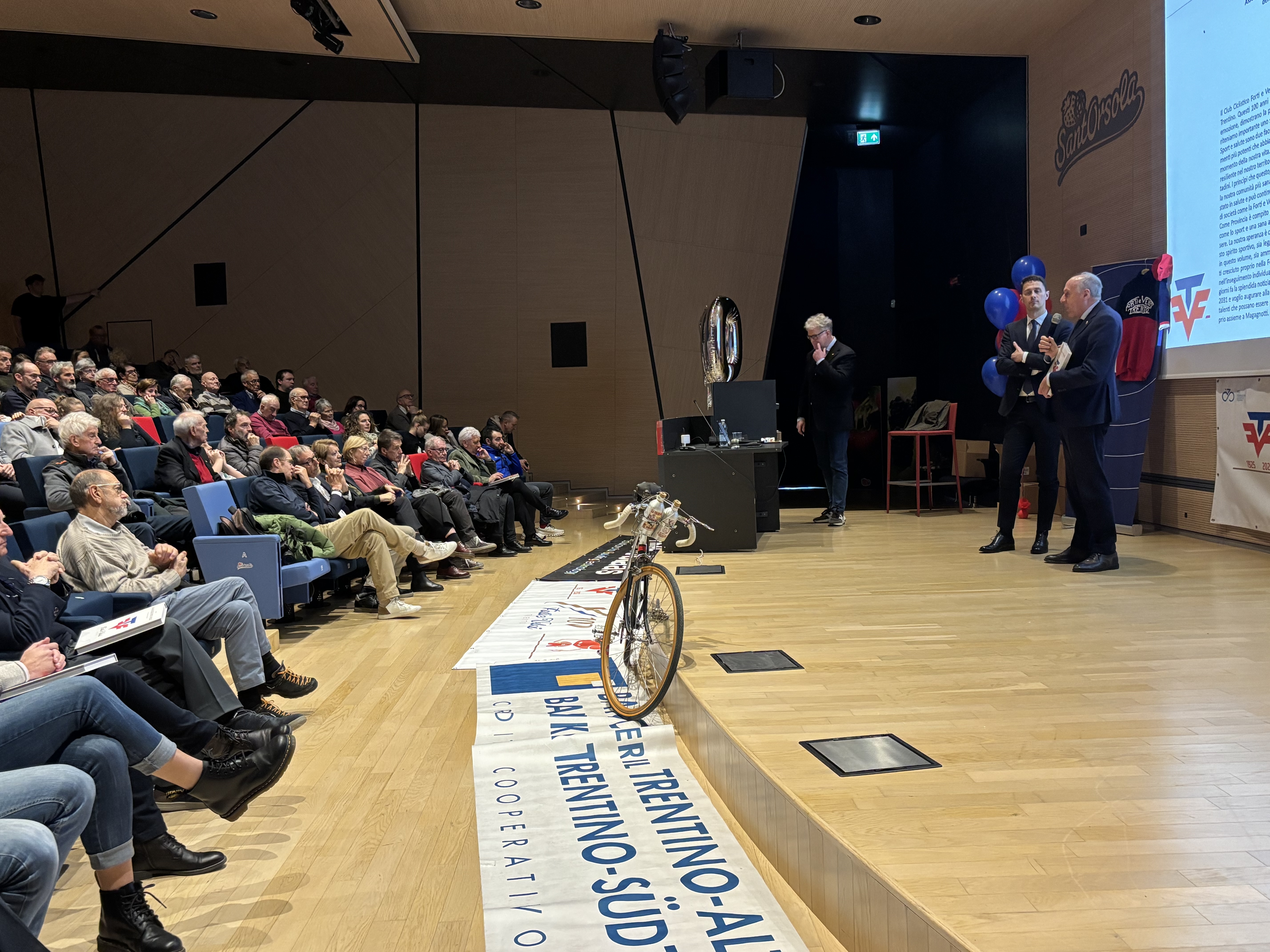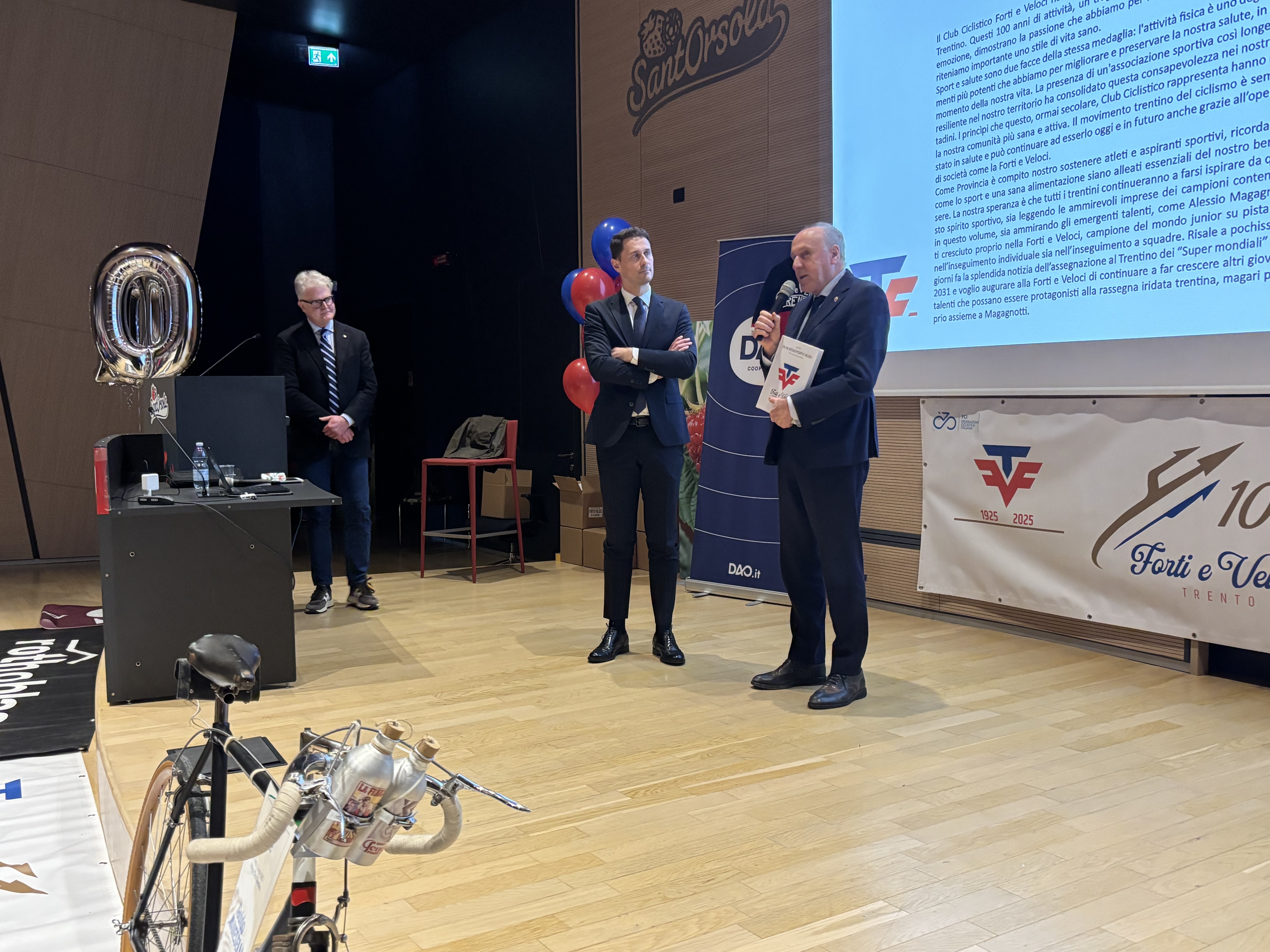 Tanti i presenti alla cerimonia per celebrare i cento anni del Club ciclistico Forti e Veloci: oltre all’assessore Tonina, vi erano il presidente del Consiglio provinciale Claudio Soini, la presidente del Coni Trento Paola Mora che ha consegnato una targa di riconoscimento alla società per le cento candeline, il presidente del Comitato trentino FCI Renato Beber, il presidente di Trentino Cycling Academy Dario Broccardo, l’assessora del Comune di Trento Franca Frizzera, oltre naturalmente ai vertici dell’associazione guidati dal presidente Alessandro Groff, allo staff tecnico e al presidente onorario Fulvio Valle. Fra il pubblico atleti e atlete, soci, simpatizzanti e volontari. Presenti anche il consigliere provinciale Walter Kaswalder e Dario Pegoretti, ideatore del Museo del Paracarro.