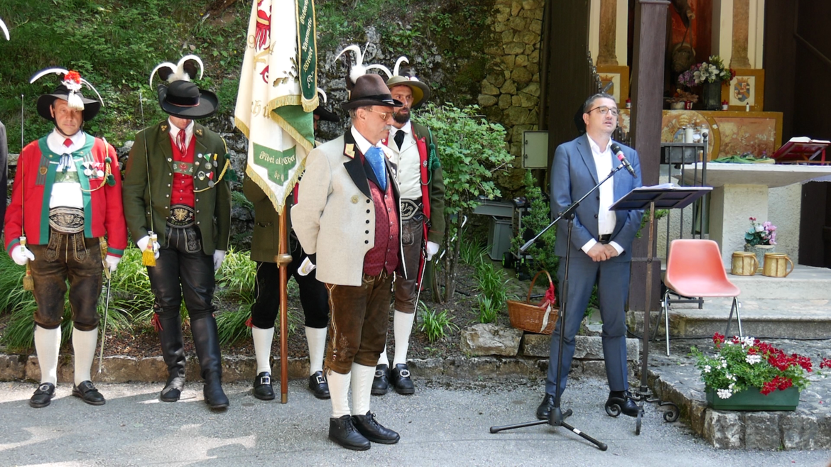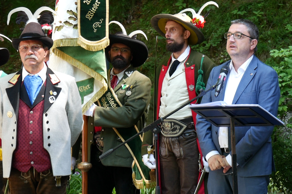 “Oggi siamo qui per ricordare un uomo di importanti valori, Andreas Hofer. Valori che hanno radici profonde nella storia, ma che voi Schützen rendete quotidianamente attuali nel nostro presente. Sono, quindi, valori che vengono preservati nei nostri territori, nelle nostre famiglie e nelle nostre comunità, e voi ne siete la rappresentazione concreta. Ringrazio il Landeskommandant Enzo Cestari per la positiva collaborazione che abbiamo sinora avuto, anche nella mia veste di presidente dell’Euregio. Voglio ricordare in tal senso le iniziative fatte assieme a voi in questa cornice istituzionale, fra le quali i Percorsi di Andreas Hofer e la vostra partecipazione a eventi come la recente Festa dell’Euregio ad Ala. In occasione dell’apertura della sede dell’Euregio a Trento, abbiamo inoltre collaborato con i giovani Schützen. Ma oggi qui voglio ricordare anche le iniziative di carattere identitario, come le bandiere dell’Euregio visibili da chi accede al nostro territorio e la possibilità data ai Comuni di esporre cartelli che esprimono appartenenza a questa istituzione. Voglio quindi ringraziare anche le municipalità trentine per la loro partecipazione e per la loro costante vicinanza all’Euregio.”