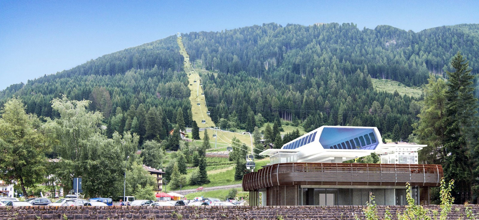 Il progetto prevede la realizzazione di una moderna telecabina con cabine da dieci posti, che partirà dal piazzale Navalge, nel centro di Moena, e raggiungerà la località Valbona, in prossimità dell’attuale stazione intermedia della cabinovia Ronchi–Valbona–Le Cune, garantendo un collegamento diretto e funzionale con il comprensorio sciistico.