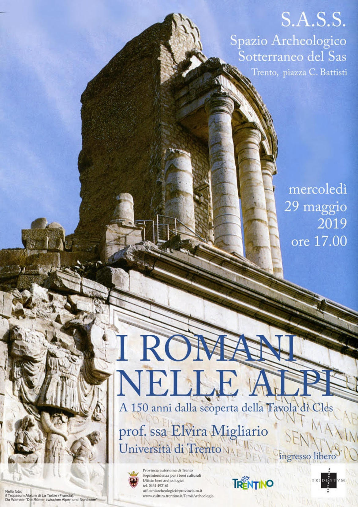 Mercoledì 29 maggio, alle ore 17, allo Spazio Archeologico Sotterraneo del Sas, in piazza Cesare Battisti a Trento, si terrà l’incontro “I Romani nelle Alpi. A 150 anni dalla scoperta della Tavola di Cles” tenuto da Elvira Migliario docente di Storia romana presso il Dipartimento di Lettere e Filosofia dell’Università di Trento. L’iniziativa si svolge nell’ambito delle attività di valorizzazione del patrimonio culturale curate dall’Ufficio beni archeologici della Soprintendenza per i beni culturali provinciale.
