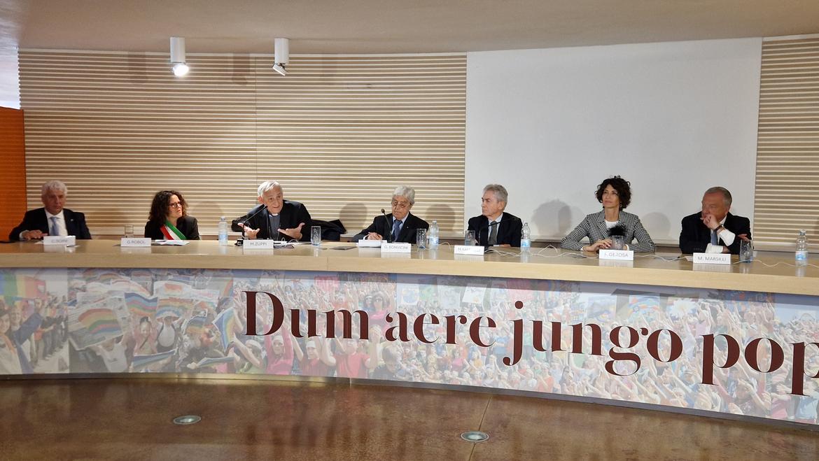 Prima della cerimonia di benedizione della Campana, la mattina si è aperta con l’incontro pubblico nel quale sono state analizzate lepiù gravi crisi internazionali odierne e si è ragionare sui metodi da utilizzare per far prevalere il dialogo sulle armi. Al meeting hanno partecipato, oltre all’assessore Gerosa, il reggente della Fondazione Campana dei Caduti Marco Marsilli, la sindaca di Rovereto Giulia Robol, il presidente del consiglio provinciale Claudio Soini, il Cardinale Matteo Maria Zuppi e l'Onorevole Mario Raffaelli. "E' bello essere qui – ha ammesso il presidente del consiglio provinciale Claudio Soini - per celebrare la scelta coraggiosa e feconda che fu fatta cento anni fa per onorare tutti i caduti della guerra mondiale, senza distinzione di uniforme. Non credo sia un caso se questa intuizione potente prese forma in Trentino, terra dove la cultura della pace si è poi solidamente sviluppata anche per superare nel territorio regionale il conflitto interetnico, facendone un'opportunità di feconda convivenza. Il Consiglio provinciale aderisce convintamente al progetto di pace di Maria Dolens e per questo proprio martedì 21 ottobre terremo qui una seduta straordinaria per riflettere sul valore irrinunciabile della pace. Che non è mai un punto d'arrivo, ma una responsabilità da vivere ogni giorno".