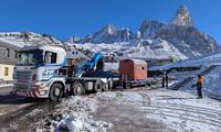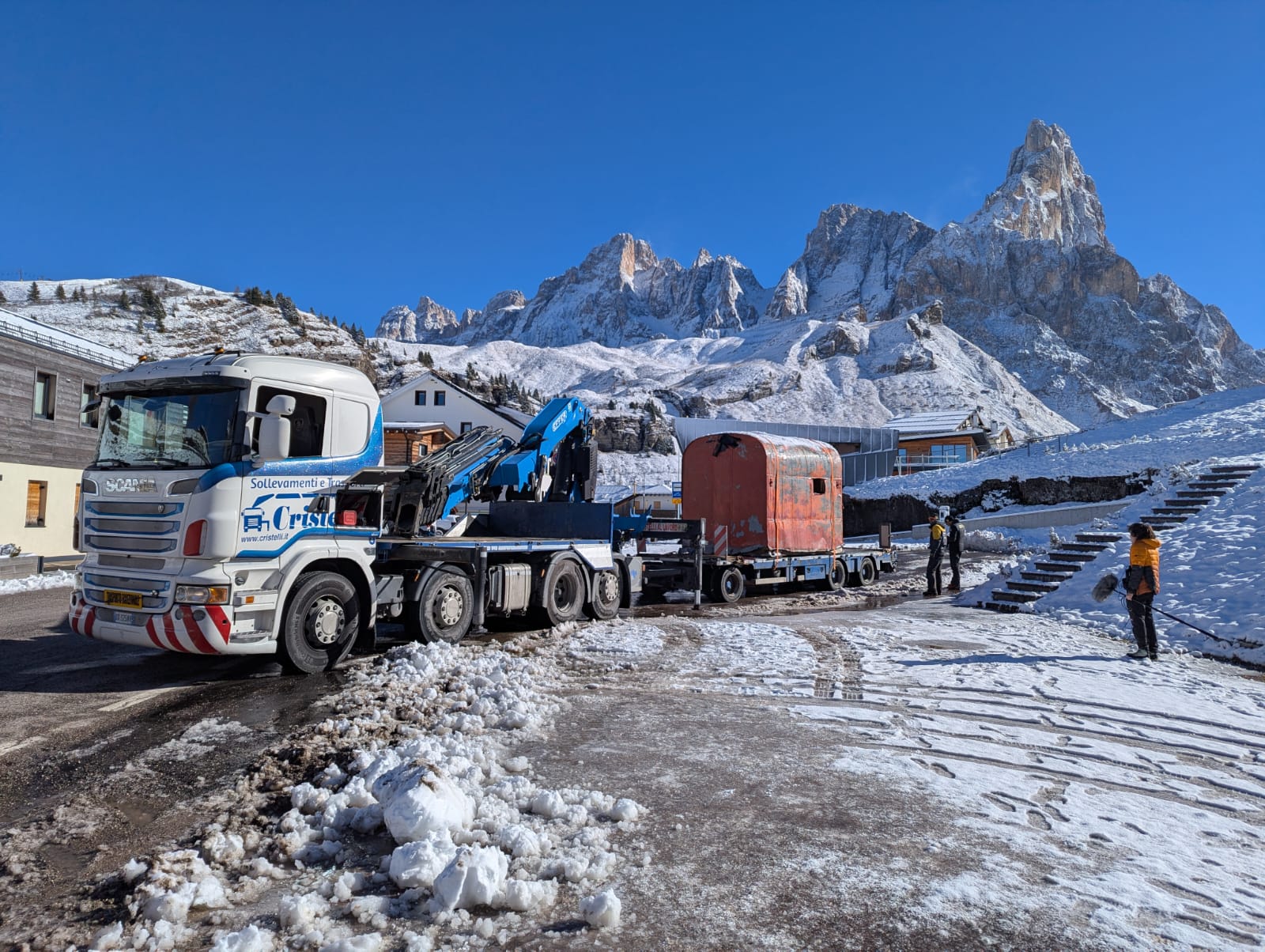 Dalla Spalla del Cimon, lungo la via normale al Cimon della Pala, sul versante sud del massiccio il bivacco è stato trasportato con un elicottero fino a Passo Rolle. Di qui un camion del Servizio per il Sostegno Occupazionale e la Valorizzazione Ambientale della Provincia autonoma di Trento lo ha trasportato fino al Museo dove è stato issato, grazie a una gru, fino sulla terrazza.