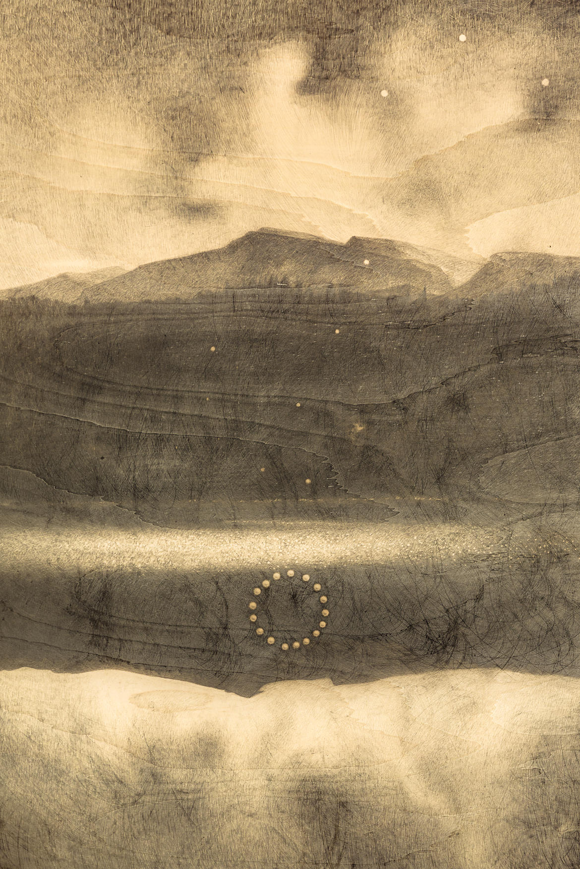 «Questo paesaggio» spiega l’artista «nasce da un riflesso sull’acqua di un lago sulle montagne del parmense, non tanto lontano dal mio studio. Nasce da un viaggio del dolore che ha cercato di cogliere nel silenzio di un “Riflesso” e di una matita Faber Castell su legno quell’attimo che precede ogni cosa: nascita, vita, morte, luce e ombra e infine rinascita. Frutto di uno scatto veloce fatto con un cellulare, il lavoro si è tradotto nell’opera dopo un lungo e lento sovrapporsi di segni larghi un millimetro o poco più. Il carbonio della grafite riflette la luce mettendo in evidenza le venature dell’albero su cui ho disegnato, restituendo così il tempo della sua crescita, in un sovrapporsi cangiante tra il soggetto e la natura della tavola su cui ho lavorato per tanti mesi. Questo paesaggio è uno sconfinamento della rappresentazione tra la natura del pioppo e la mia matita che lo ha disegnato».