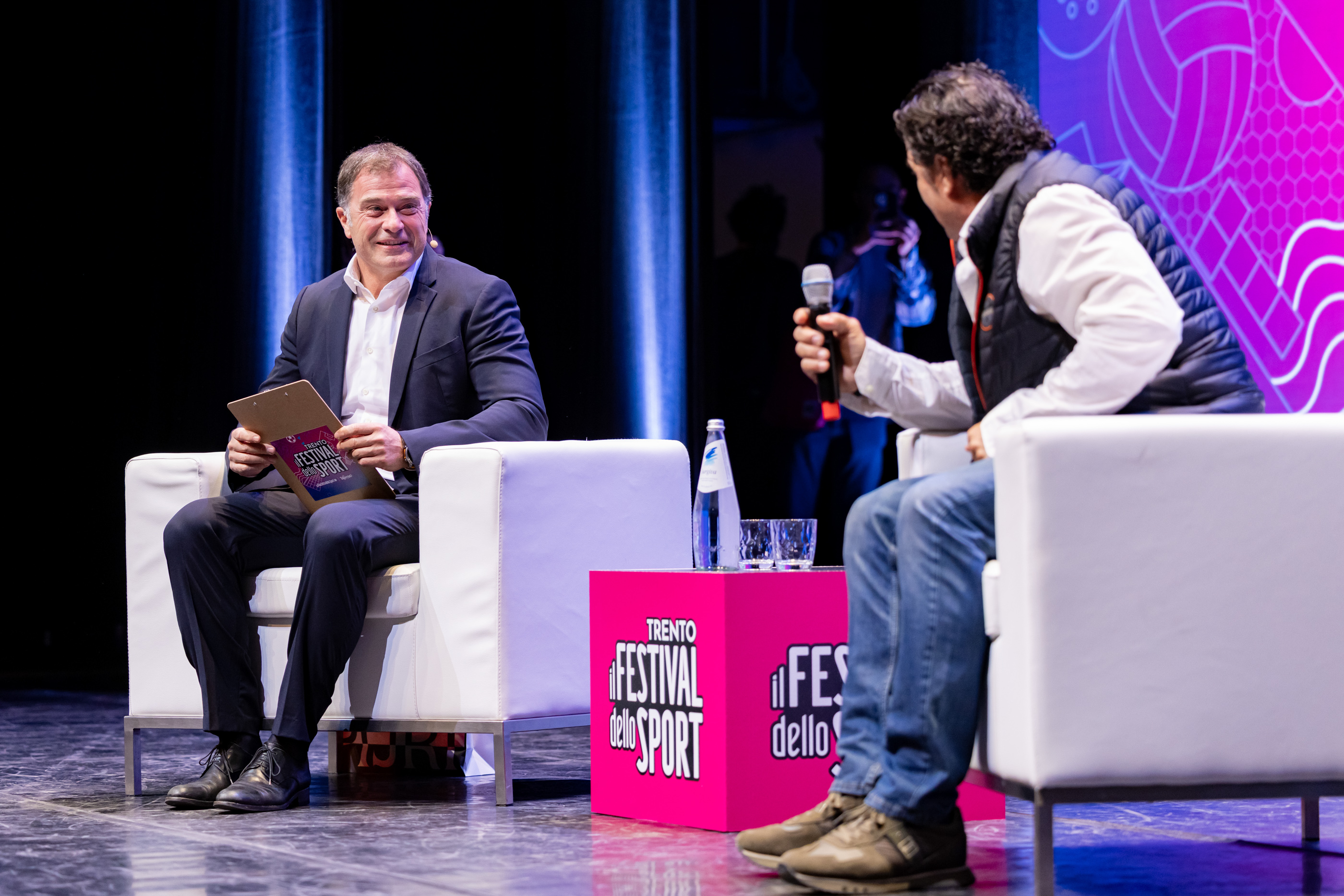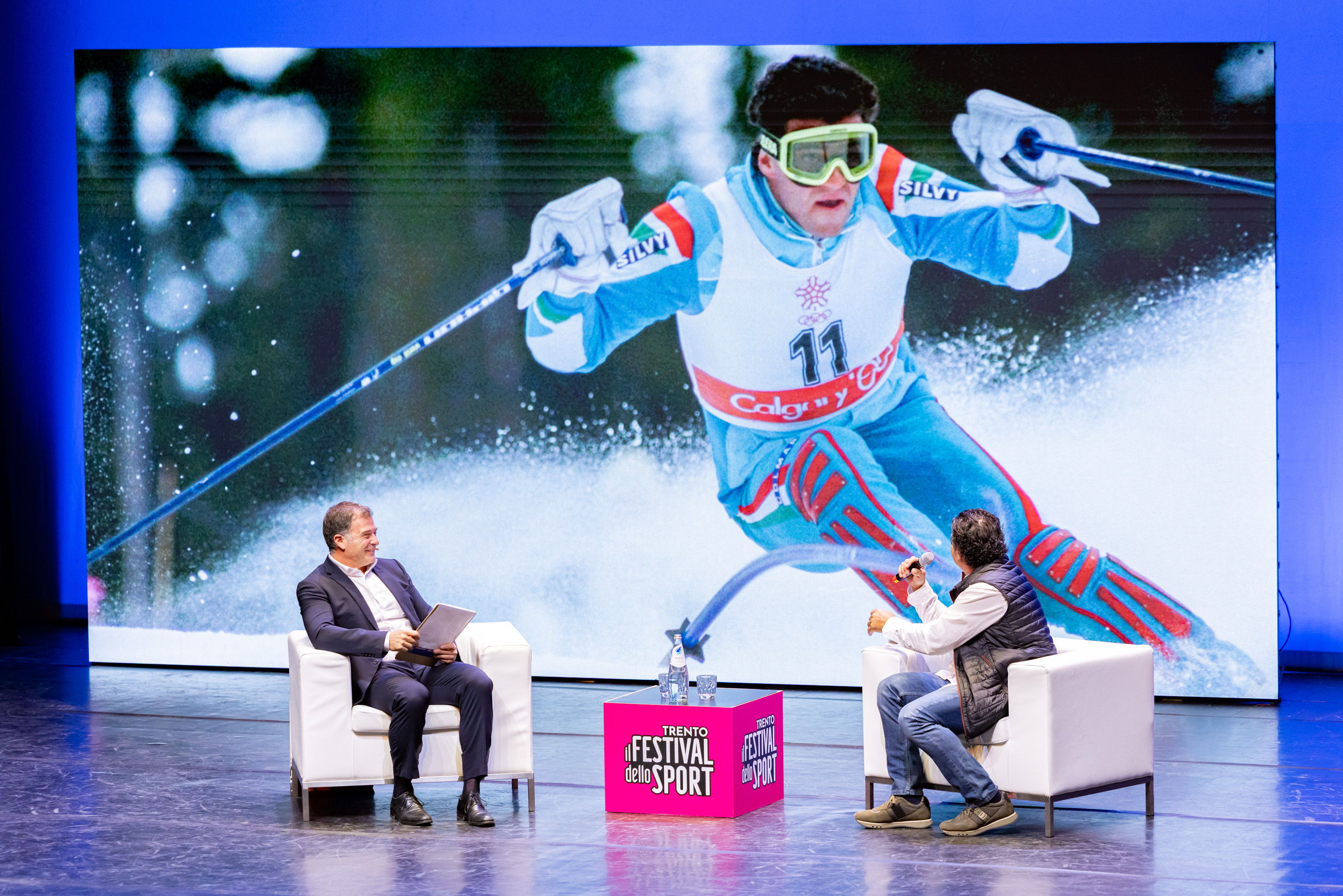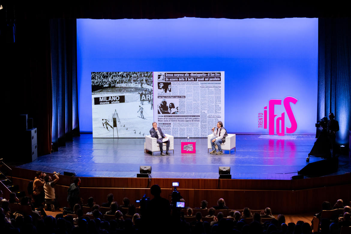 Nel viaggio fotografico non manca l’ironia. Sullo schermo scorrono immagini del suo fan club di Castel De Britti, che conserva cimeli di ogni genere, lettere, ritagli. I suoi fan lo hanno sempre seguito, in capo al mondo. «A Sierra Nevada ho dormito in malga per paura di perdere la gara» rivela il capo del Fan club Loris dal pubblico. Perché quella di oggi non è un’intervista standard. Dalla platea si alzano compagni di viaggio e di vita ad aggiungere colore ad una storia già bellissima.