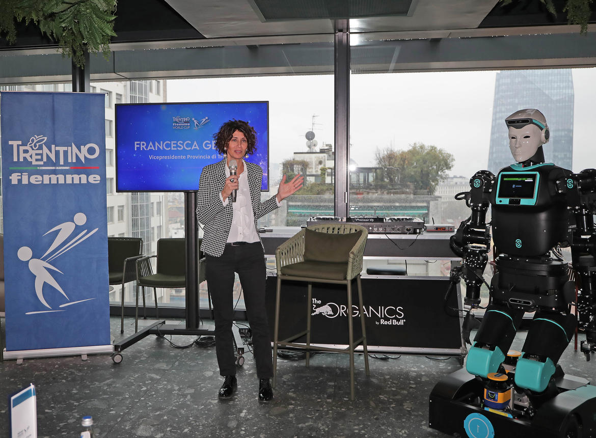 Dinamici video con gli highlights delle gare in Val di Fiemme e siparietti con il robot umanoide di Oversonic fanno scorrere veloce il tempo alla conferenza stampa, dove RoBee introduce anche Lorenzo Pala, responsabile InFront degli eventi della Val di Fiemme, la società che gestisce e distribuisce i diritti TV nel mondo: “posso dire con assoluta certezza che la Cermis Final Climb della Val di Fiemme fa registrare di anno in anno i migliori dati di ascolto dell’intero circuito World Cup. Si tratta di un enorme lustro e siamo confidenti che tutto ciò sarà confermato anche nella stagione a venire: InFront e FIS collaborano intensamente per migliorare di anno in anno anche i tempi di messa in onda che ci fanno essere fiduciosi per consolidare i nostri dati d’ascolto anche per questo 2024/2025. Ci interfacciamo di continuo con il comitato locale trentino, preparandoci con droni e attrezzatura di qualità per trasmettere il meglio della Val di Fiemme e dei nuovi tracciati tra lo Stadio del Fondo e l’Alpe Cermis”.