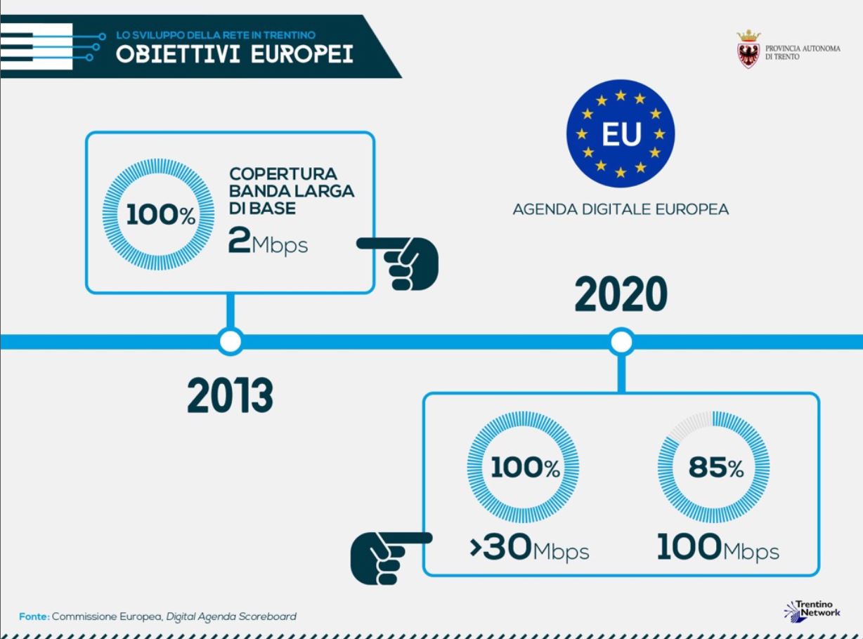 Il traguardo dei 100 Mbps di velocità di navigazione Internet per la stragrande maggioranza degli utenti trentini entro il 2020 sarà possibile perché il Trentino è uno dei pochi territori italiani a poter contare su una dorsale pubblica di fibra ottica, che conta oltre 1.100 chilometri, in grado di attraversare i centri urbani e raggiungere le valli periferiche. Senza questa autostrada digitale, terminata nel 2014 e finanziata per intero dalla Provincia autonoma di Trento con una spesa di 135 milioni di euro, oggi tutto sarebbe più difficile.