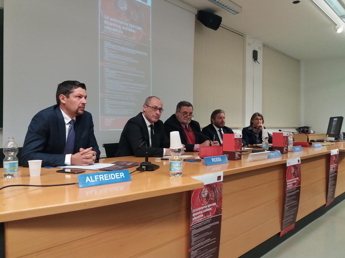 Ad affiancare il governatore del Trentino, oggi alla Facoltà di Giurisprudenza per il dibattito “Quale architettura istituzionale per il regionalismo differenziato italiano?”, vi erano Esther Happacher e Roberto Toniatti, che hanno proposto una sintesi dei lavori del giorno precedente, quindi l'onorevole Gianpiero D’Alia, presidente della Commissione parlamentare per le questioni regionali, ha spostato il focus sui tentativi referendari dell'ultimo decennio e sulla necessità, visto il loro fallimento, di partire per la riforma dal sistema costituzionale in essere. Infine Daniel Alfreider, parlamentare di lingua ladina, ha spiegato come l'Autonomia sia "un percorso dinamico a lungo termine", al quale è necessario lavorare con costanza, anno dopo anno.