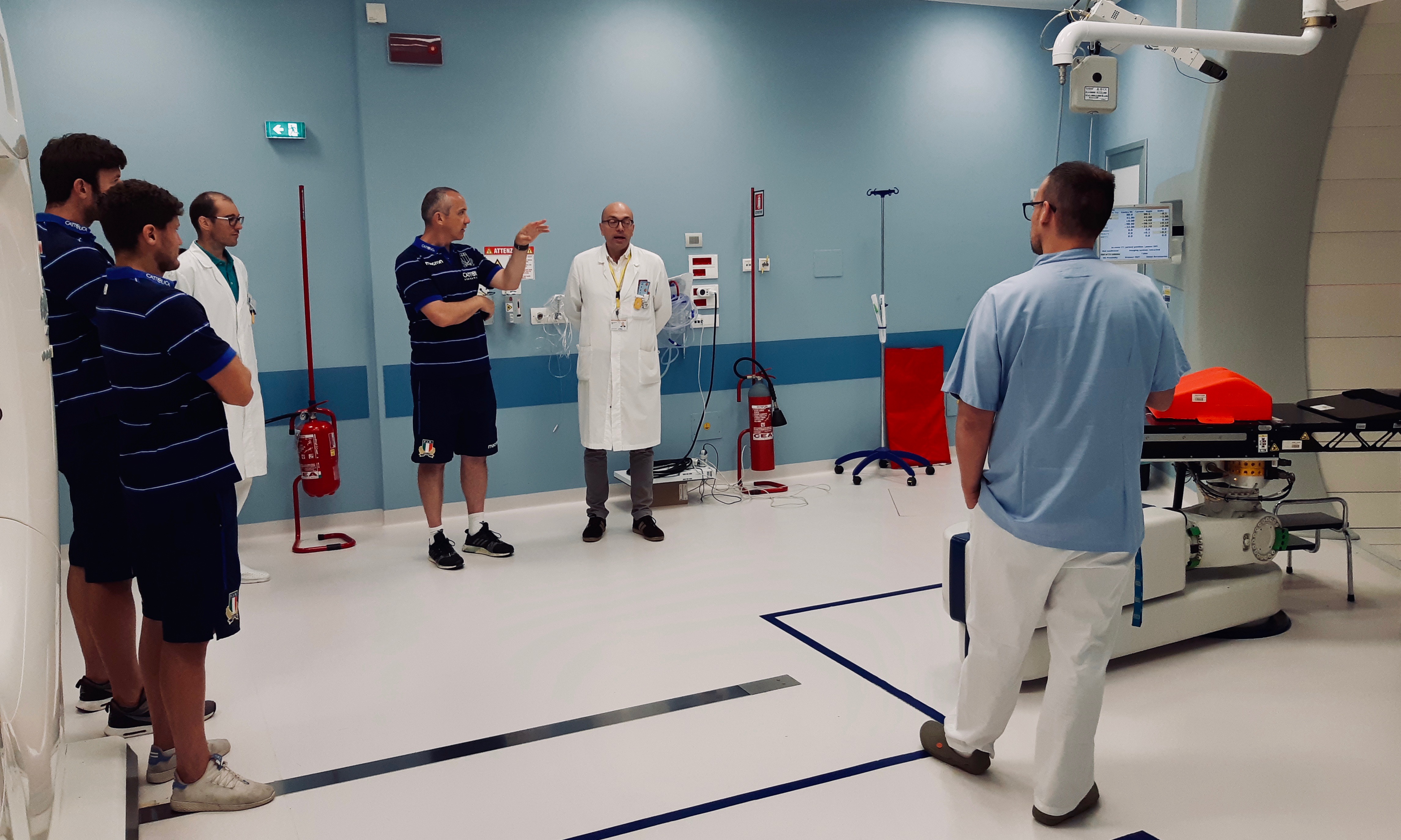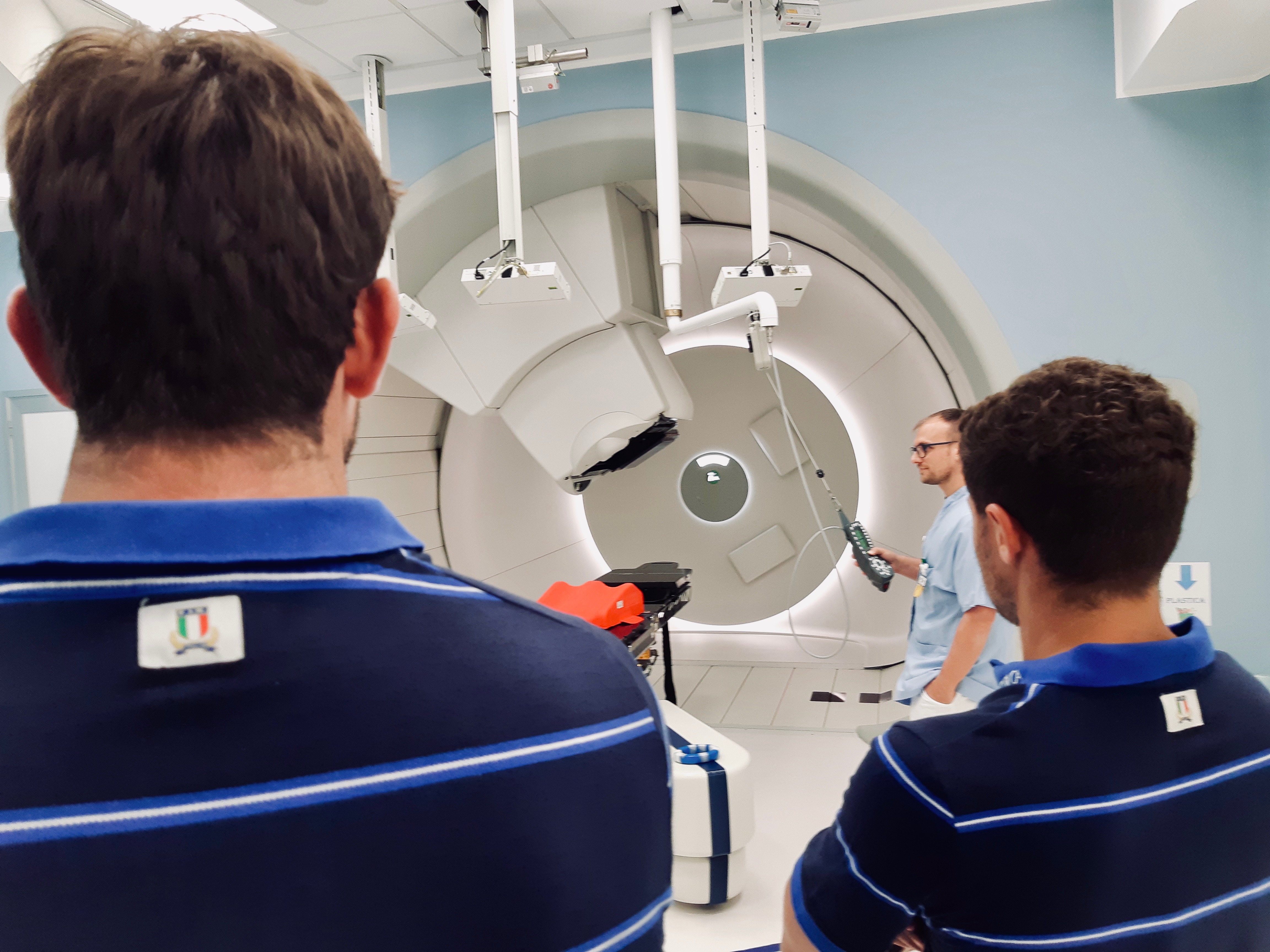 I medici e i fisici dell’Unità operativa di protonterapia hanno accompagnato la delegazione dell’Italrugby a visitare i diversi spazi del Centro, in particolare il gantry, la camera di trattamento, e il ciclotrone, l’enorme sistema che trasporta e rilascia il fascio di protoni. Gli atleti hanno mostrato grande interesse per l’attività del centro e in particolare per quella dedicata ai bambini. La protonterapia è infatti un trattamento particolarmente utile nel caso di tumori in età pediatrica, perché rispetto al trattamento tradizionale ai raggi X riduce il rischio di difetti nella crescita e di problemi nello sviluppo. Dopo aver visitato le varie sale della struttura, i ragazzi dell’Italrugby hanno voluto incontrare i piccoli pazienti per regalare loro qualche momento di spensieratezza, prima di tornare in ritiro a Pergine.
