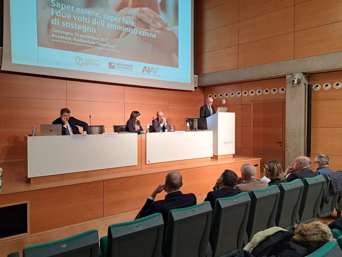 I lavori sono proseguiti con tre relazioni di carattere tecnico, con il contributo dei relatori Giuseppe Buffone, Michele Ballardini e Adriano Deimichei su temi quali l’esercizio dei diritti alla luce del futuro quadro europeo, la gestione degli interessi patrimoniali, la qualità di vita dei beneficiari e lʼimpegno delle banche di territorio nell’ambito dell'istituto dell'amministrazione di sostegno. Ha moderato Benedetta Pensini, presidente dell’associazione Comitato per l'Amministratore di Sostegno in Trentino.