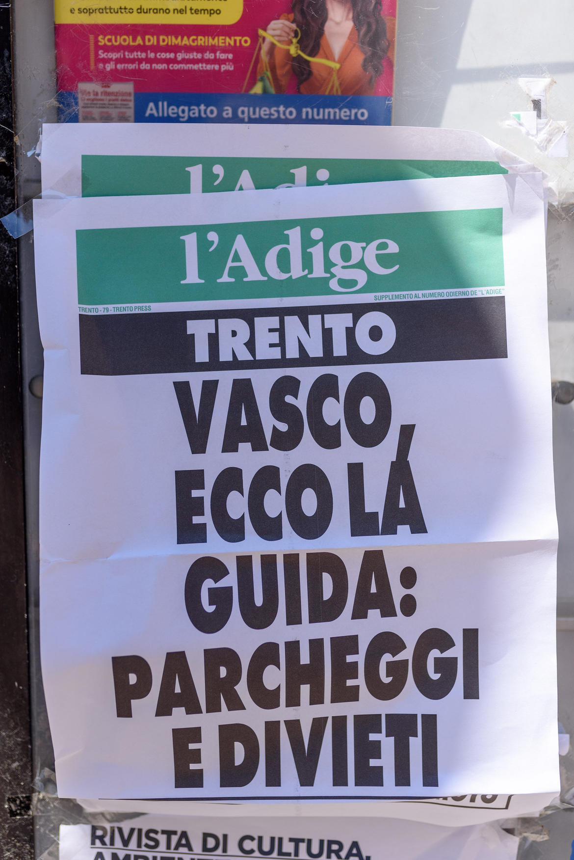 Nel frattempo, il senso di attesa cresce e la città prosegue nei preparativi. Le forze dell’ordine sono presenti in centro, così come nel resto della città i volontari, a partire dall’associazione alpini e a tutti gli altri. Non mancano i colori del merchandising di Vasco, spillette, magliette, che si aggiungono a quelli di Trento, città dei Festival. Il blu dei cartelloni del Trento film festival, da poco concluso, l’arancione di quelli del Festival dell’Economia, dal 2 al 5 giugno. Oltre al cielo fortunatamente azzurro e al verde delle montagne.
