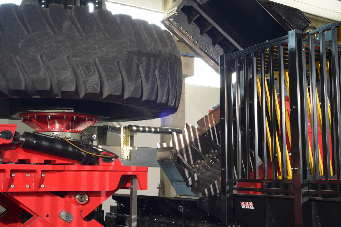 “La gomma trasportata da un muletto” spiega Samuel Salvadori, co-fondatore della società e inventore di MT-REX “viene deposta in una specie di culla meccanica che la aggancia e le permette di stare in piedi, dopodiché viene inforcata da un mandrino che la orienta in posizione orizzontale su un perno che la fa girare. A questo punto delle grandi cesoie iniziano a tagliarla in un numero di spicchi che può essere programmato a seconda della grandezza del pneumatico e delle esigenze del cliente, spicchi destinati su un nastro trasportatore che li farà arrivare sul camion diretto verso gli impianti di riciclo”.