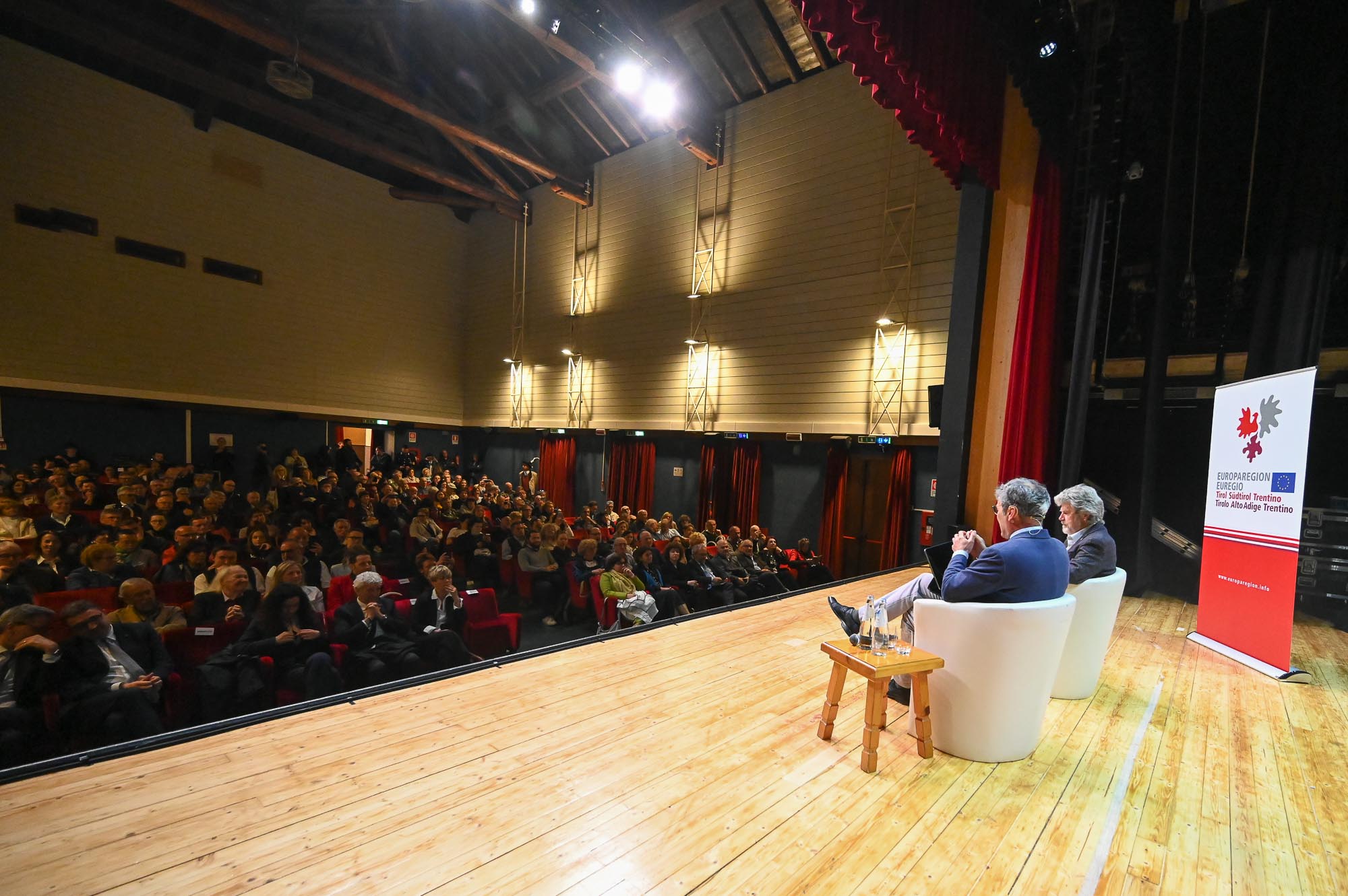 L’alpinista ha voluto ripercorrere gli eventi salienti che hanno caratterizzato il passato della nostra terra, trovando anche nella musica, sulle note del brano “Andrea” di Fabrizio De André, lo strumento ideale per richiamare alla memoria della platea, emozioni di tempi passati, ma forse non troppo lontani, e di temi così intimi e delicati come la sofferenza che accompagna i venti di guerra. Ed è stato proprio attraverso i grandi temi della nostra attualità che Messner ha dato la sua personale lettura di Euregio. A partire dall’ambiente. A quasi un anno dal tragico crollo del ghiacciaio della Marmolada, Messner racconta di una montagna che è viva e che naturalmente è portata a crollare, anche se più repentinamente negli ultimi anni a causa del riscaldamento globale. “La natura non fa errori - ha affermato Messner - è l’uomo che può fare errori, anche se l’uso dell’energia fossile che ha sostenuto l’invenzione dell’industria moderna non si può dire che sia stato un male voluto. Non era possibile prevederne le conseguenze e va detto che il riscaldamento globale influisce solo parzialmente su questo tipo di eventi. Ecco perché è importante che i giovani d’oggi - ha sottolineato l’alpinista - siano consapevoli delle radici della ricchezza di cui godono nella modernità. Essi devono conoscere la storia, devono studiarla, portare progetti e correzioni, non mera critica”.