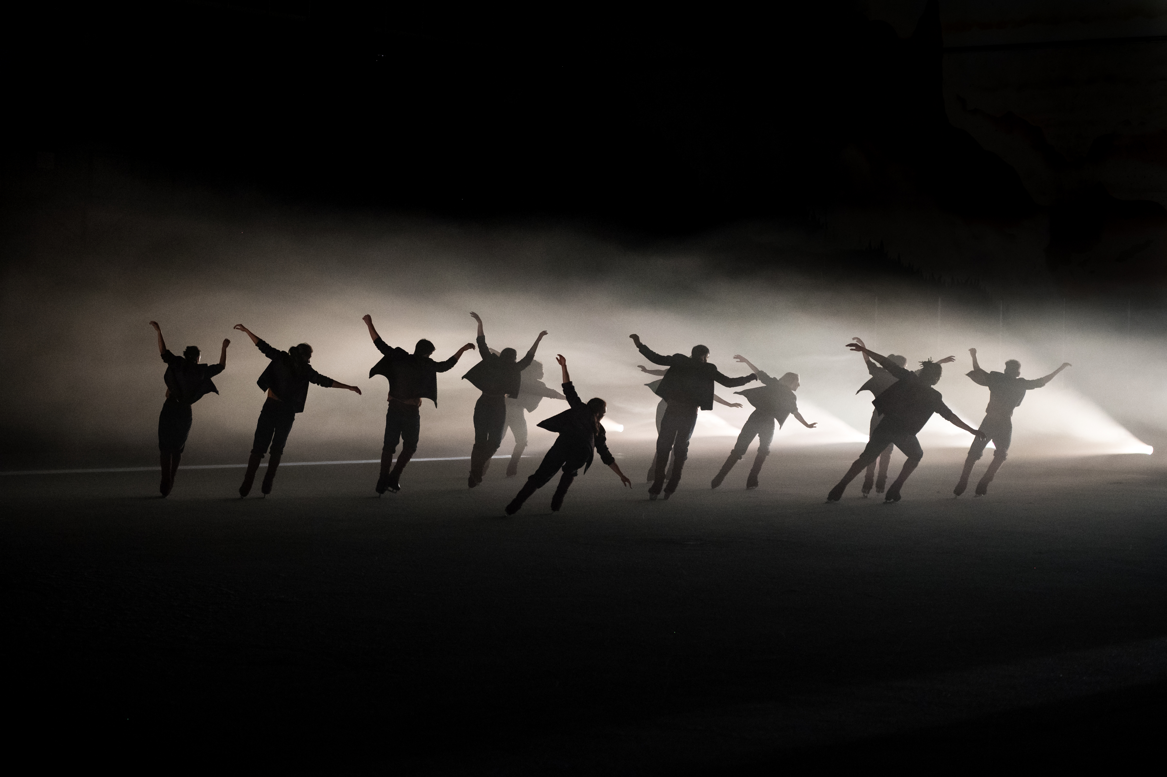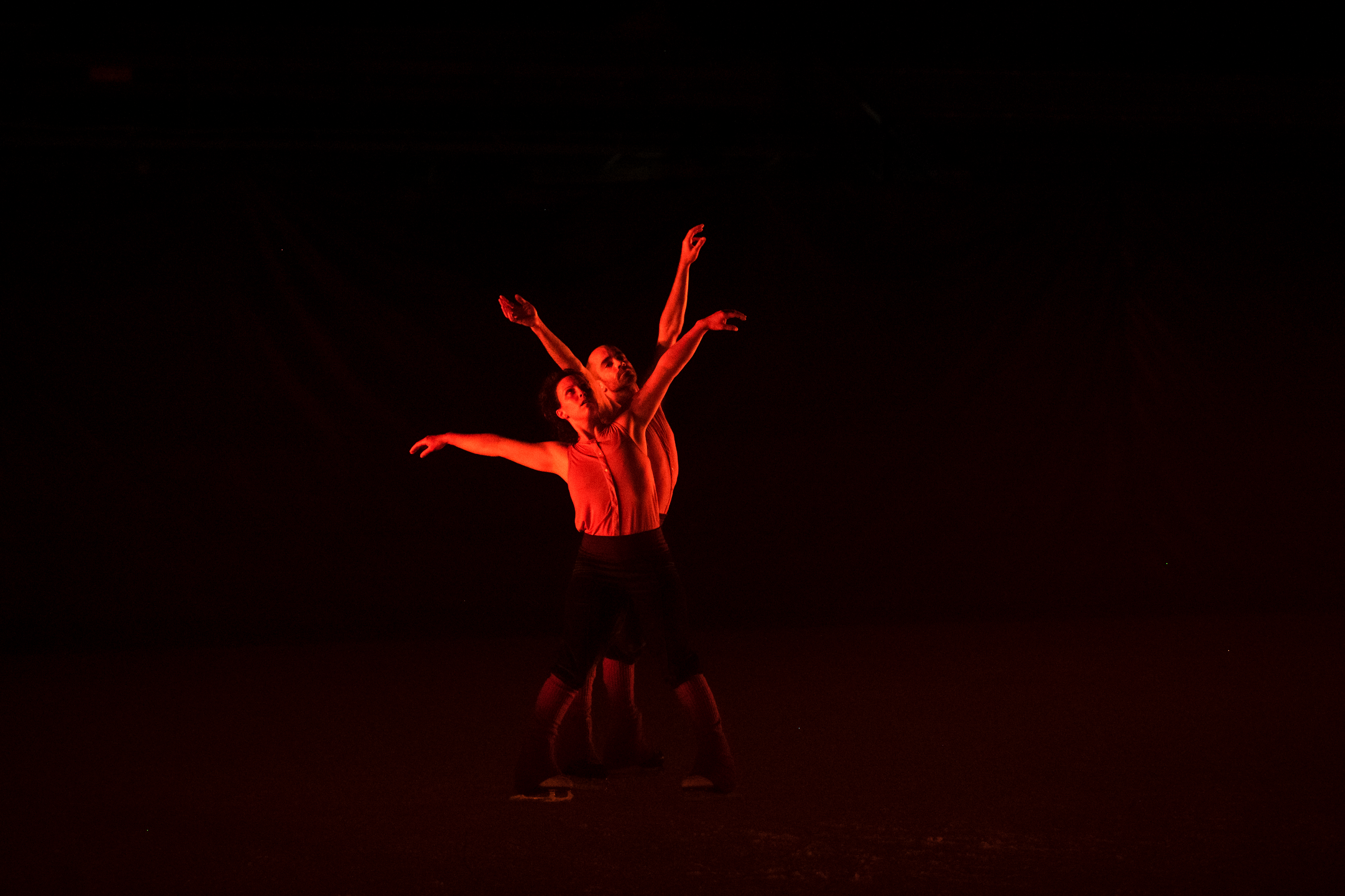 Ispirato proprio a quei suggestivi “mormorii”, Murmuration è una trasposizione umana di quell’incanto collettivo. Non un semplice spettacolo su ghiaccio, ma un’opera coreografica complessa e fluida, in cui quindici danzatori e acrobati trasformano la pista in un palcoscenico dinamico, dove la velocità del volo planato incontra la grazia del movimento sincronico.