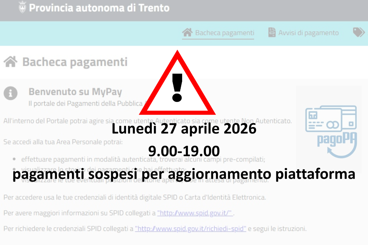 L’avviso della sospensione del servizio di pagamento e successivi aggiornamenti saranno pubblicati sulla pagina: https://mypay.provincia.tn.it/apps/cittadino/home