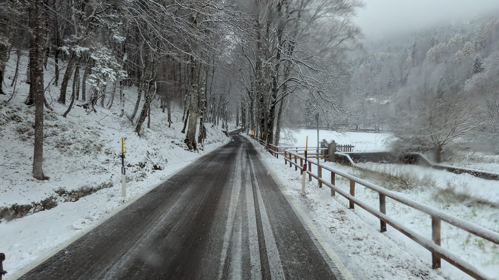 SP230 dei Dossioli: neve presso Pra Alpesina (Avio), attenzione in entrambe le direzioni.