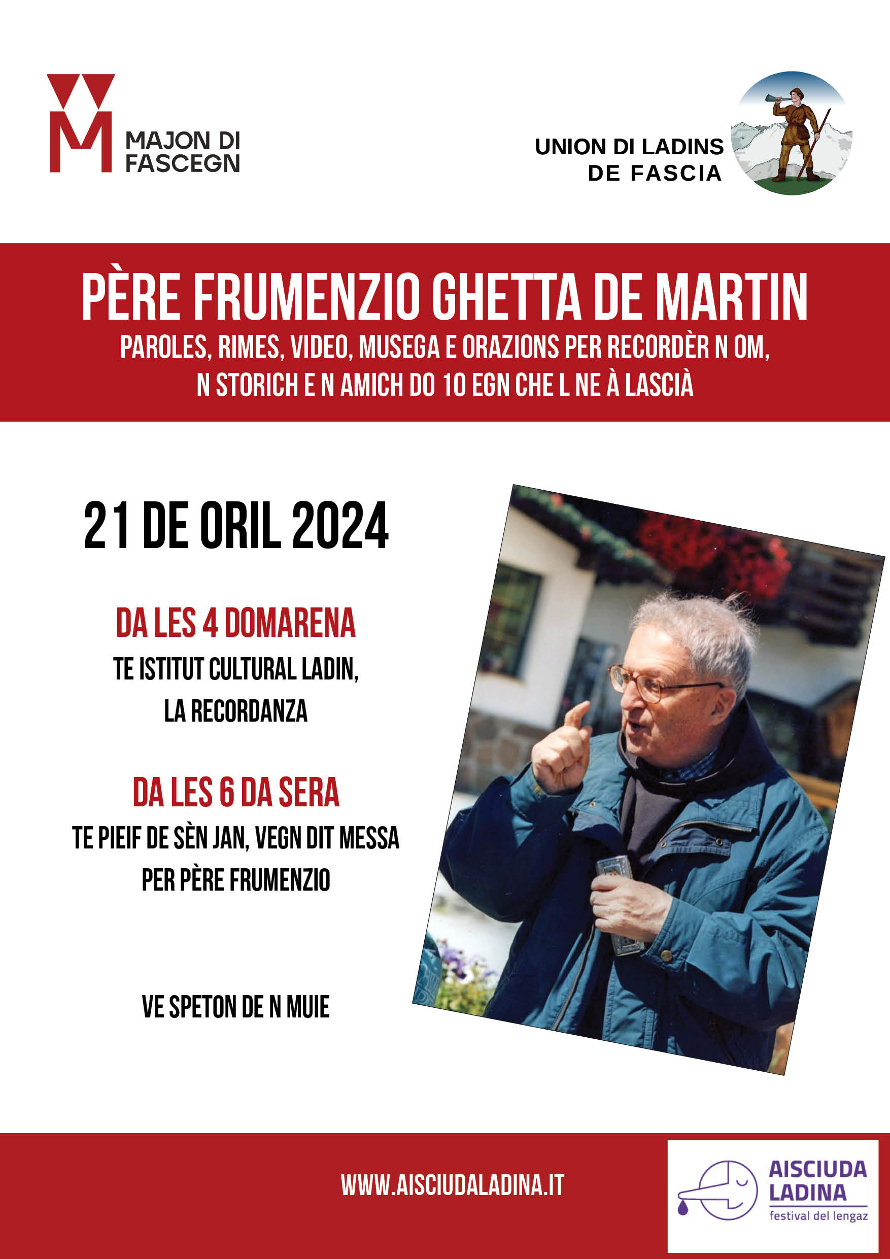 Domenica 21 aprile, alle 16.00 presso la sede dell’Istituto Culturale Ladino a San Giovanni di Fassa, Strada de la Pieif 7, la Majon di Fascegn e l’Union di Ladins de Fascia ricorderanno Padre Frumenzio Ghetta de Martin dieci anni dopo la sua scomparsa, nell'ambito delle iniziative dell'Aisciuda Ladina.