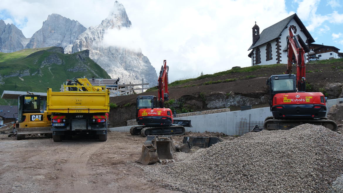 Procedono i lavori di riqualificazione e realizzazione di spazi pubblici destinati a servizi collettivi sulla area prima occupata dall’ex albergo “Passo Rolle”. Il fulcro del progetto è costituito da una piazzetta centrale per la socializzazione di visitatori ed escursionisti, anche per svolgere varie attività ricreative all’aperto. In fase di realizzazione un edificio info-point sospeso, la fermata per il trasporto pubblico, un punto ristoro per i ciclisti e un piccolo parcheggio di servizio per la sosta breve di auto e moto. La fine e consegna dei lavori è prevista per fine ottobre.