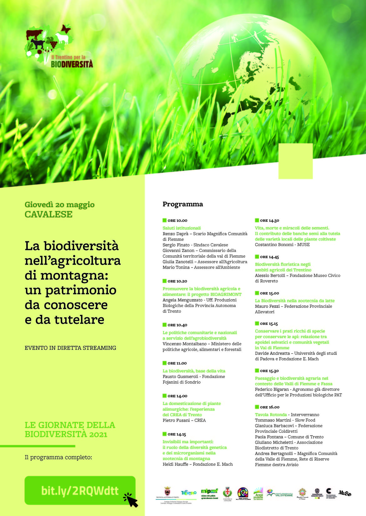 In quella che rappresenta una vera e propria settimana dedicata alla diversità - il 22 maggio ricorre la Giornata mondiale della Biodiversità - l’appuntamento che si potrà seguire on line ci aiuterà a fare il punto sulle buone pratiche adottate dalla nostra Provincia e sull'importanza della biodiversità nella vita quotidiana di tutti noi. Il convegno di Cavalese fa parte del progetto Bioagrimont "Biodiversità agraria e alimentare associata alle produzioni agricole e zootecniche di montagna, conservazione e tutela del paesaggio agrario”, promosso dalla Provincia in collaborazione con Fondazione Edmund Mach, Muse, CREA, Museo Civico di Rovereto, e finanziato dal Ministero delle politiche agricole alimentari e forestali, per preservare la biodiversità agricola e alimentare.
