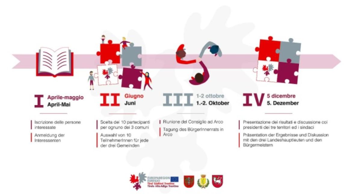 Le persone residenti nei tre comuni di Hall in Tirolo, Bressanone e Arco e che raggiungono i 18 anni di età entro il 30.09.2022 possono dichiarare la loro disponibilità ed il loro interesse a partecipare al Consiglio delle cittadine e dei cittadini fino al 15 maggio 2022. Successivamente, vengono estratte a sorte, ed individuate attraverso procedura statistica, 10 persone per ciascuno dei tre comuni partecipanti. Le variabili considerate nella scelta del campionamento sono l’età e il genere. Per il solo comune di Bressanone viene anche presa in considerazione la lingua in cui le cittadine e i cittadini desiderano essere informati della loro partecipazione, nel rispetto dei 3 gruppi linguistici riconosciuti dall’ordinamento regionale. Il risultato finale sarà un Consiglio delle cittadine e dei cittadini composto da 30 membri in rappresentanza dei tre comuni partecipanti. Si precisa che le/i rappresentanti politici a livello europeo, statale, provinciale o comunale non sono autorizzate/i a partecipare al Consiglio delle cittadine e dei cittadini.