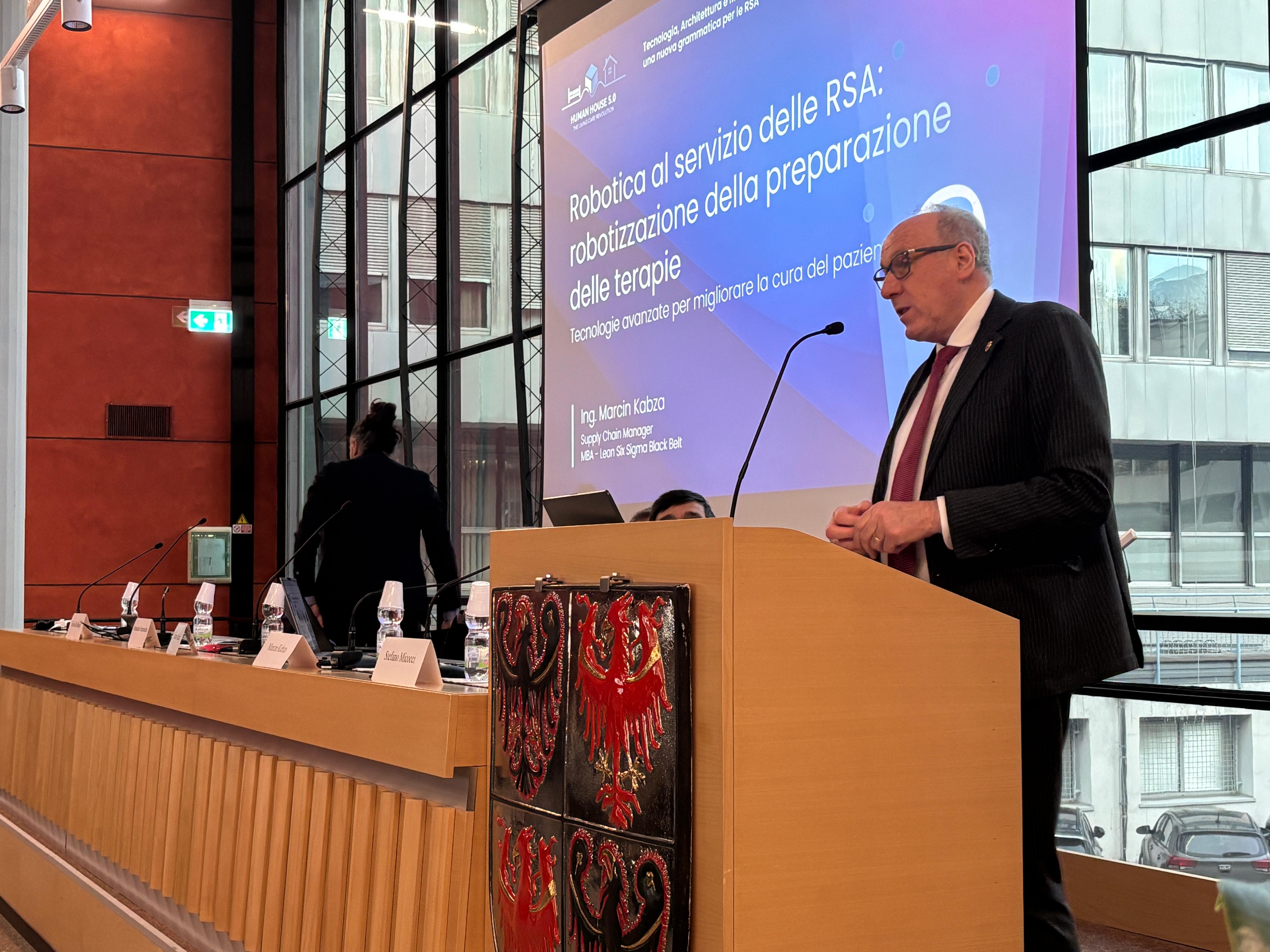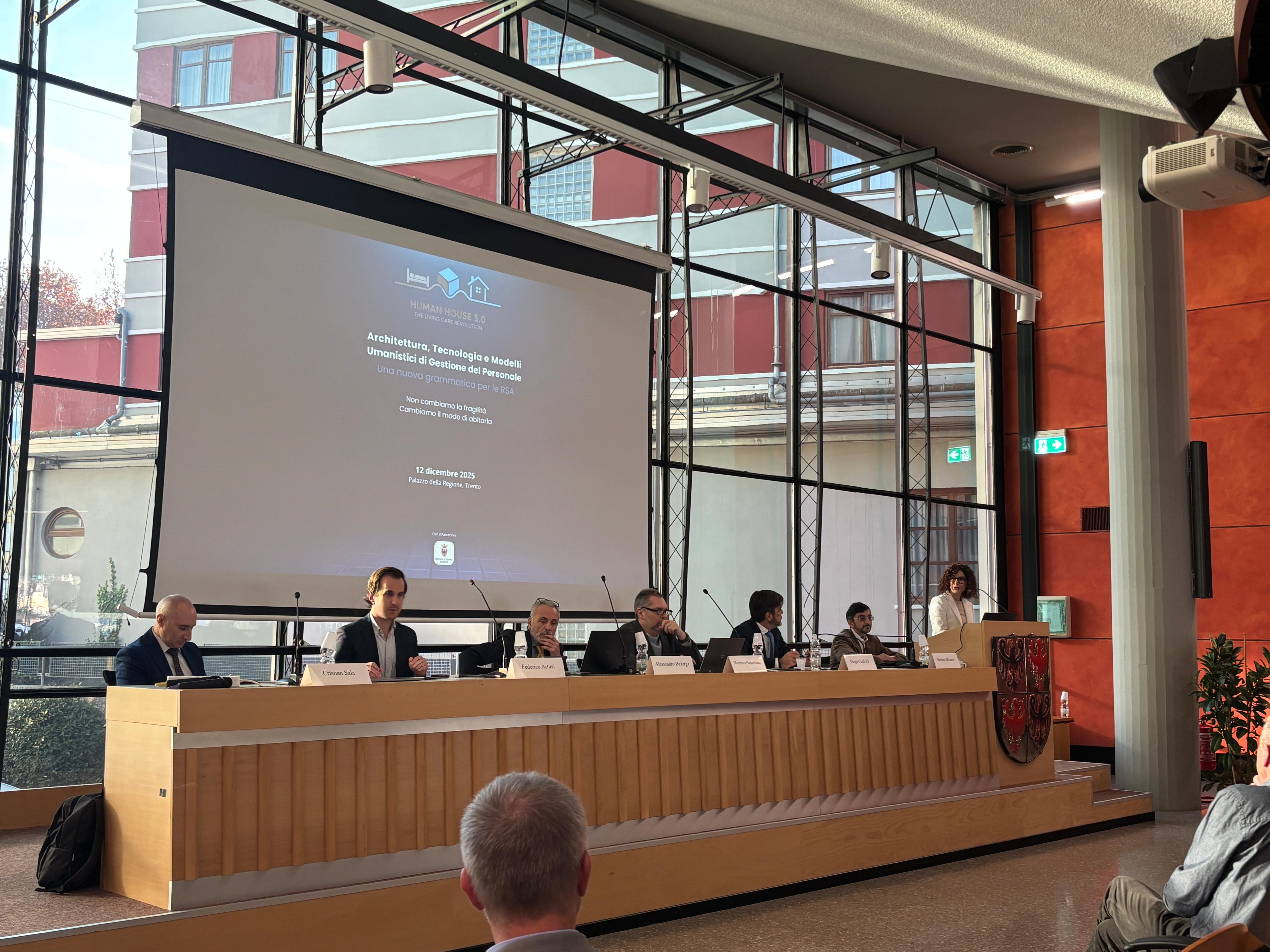 Nel pomeriggio sul tavolo dei relatori si sono alternati Marein Kabz e Adriano Ocelli hanno illustrato le potenzialità della robotica in RSA, Alessandro Franceschini ha offerto un nuovo sguardo sugli spazi dedicati alla fragilità; infine Livio dal Bosco ha presentato ufficialmente Human House 5.0, The Living Care Revolution, un modello sviluppato da APSP Residenza Valle dei Laghi e APSP Opera Romani di Nomi che unisce architettura, tecnologia e gestione umanistica in una visione integrata, capace di liberare gli operatori da percorsi e compiti faticosi.