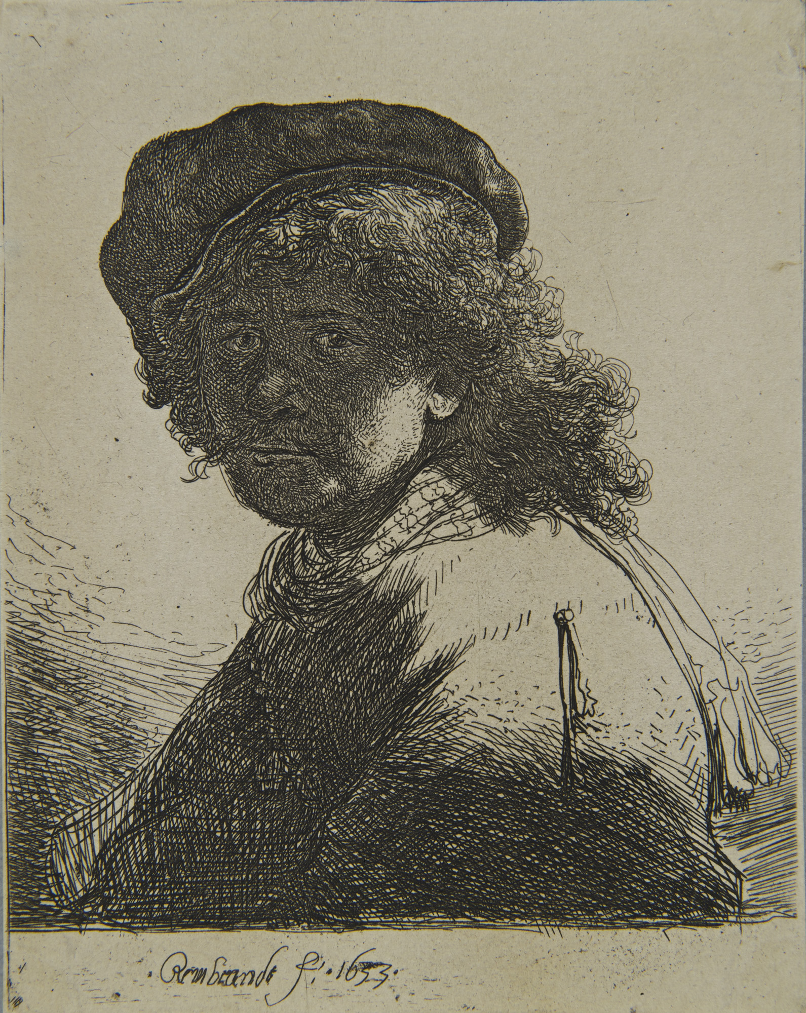 Un segno estroso, sciolto e rapido, e una forte ombreggiatura, caratterizza l’Autoritratto con cappello e sciarpa al collo, mentre l’Autoritratto con Saskia, che nell’impostazione richiama il Ritratto di Baldassar Castiglione di Raffaello, rivela la forza evocativa della lezione del Sanzio, di cui Rembrandt conosceva l’opera, attraverso una serie di stampe di traduzione contenute nei cosiddetti “libri di prestigio”, appartenuti alla collezione personale del maestro di Leida. Nei fogli dedicati alle storie dell’Antico e Nuovo Testamento l’artista riesce a catturare l’essenza drammatica degli episodi attraverso forti contrasti chiaroscurali, particolarmente evidenti nel Cristo e la Samaritana (1634) o nel Gesù caccia i mercanti dal tempio (1635) in cui la storia, compressa entro un fitto intreccio di linee vigorose, è percorsa da fasci di luce che irrompono nella scena con uno straordinario effetto teatrale. Nella maestosa impaginazione scenografica della Morte della Vergine (1639), ispirata alla omonima incisione di Albrecht Dürer, Rembrandt raggiunge uno dei suoi vertici espressivi: la corale partecipazione dei personaggi, assiepati intorno al letto, protetto da un enorme tendaggio, viene descritta con un attento studio dei sentimenti, delle emozioni e del dolore, sottolineato da un deciso segno grafico e dallo squarcio luminoso che scende dall’alto, repentino, ad indicare la solennità dell’evento e con quella particolare maniera “tutta fatta di colpi strapazzati e replicati, con gran forza di scuri” .