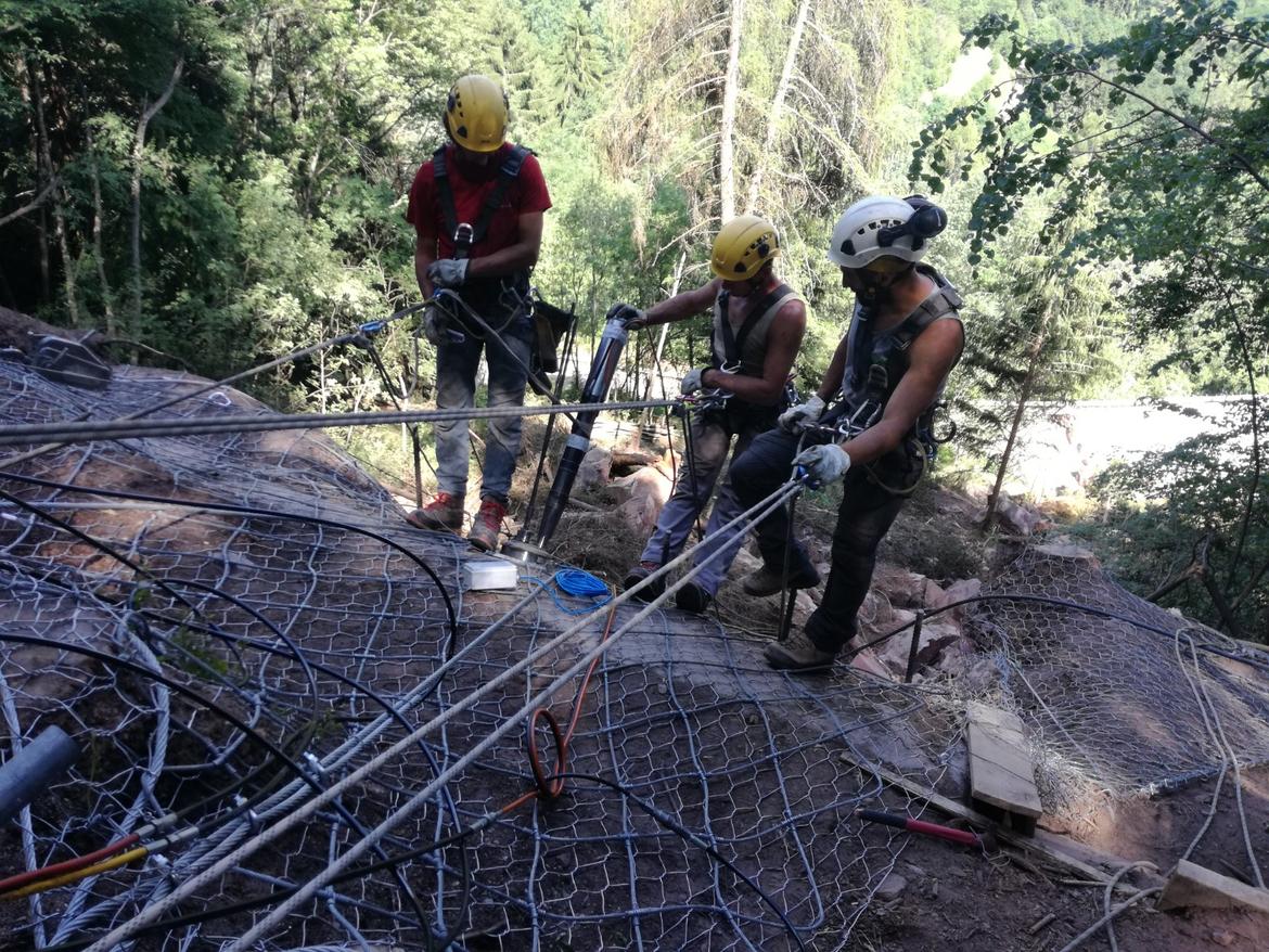 I lavori di sistemazione e la messa in sicurezza della parete interessata dai crolli sono stati affidati ad una ditta specializzata. Sommariamente gli interventi eseguiti in successione sono stati: la realizzazione di una trave armata con tiranti attivi per consolidare e bloccare la parte sommitale della parete visivamente segnata da crepe e lassi slegati dalla retrostante porzione rocciosa; disgaggio di porzioni e ammassi rocciosi lesionati e in precarie condizioni di stabilità ancora presenti in quota; stesa di pannelli e reti in fune sulla parete e successiva realizzazione di ancoraggi e tiranti attivi sul fronte verticale e al piede della parete; perforazione e brillamento dei massi di notevoli dimensioni (il più grande di circa 40 mc) rimasti lungo il versante dopo la frana; avvallamento degli stessi e realizzazione di barriera di protezione provvisoria.