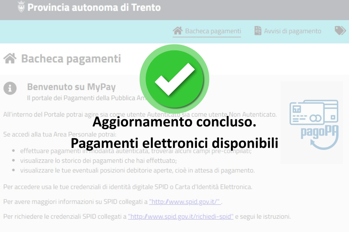 Dalle ore 14.00 il servizio è stato riattivato e i pagamenti verso gli enti aderenti sono tornati disponibili tramite tutti i canali previsti: portale MyPay, online banking, sportelli bancari e postali, tabaccherie abilitate e app IO.