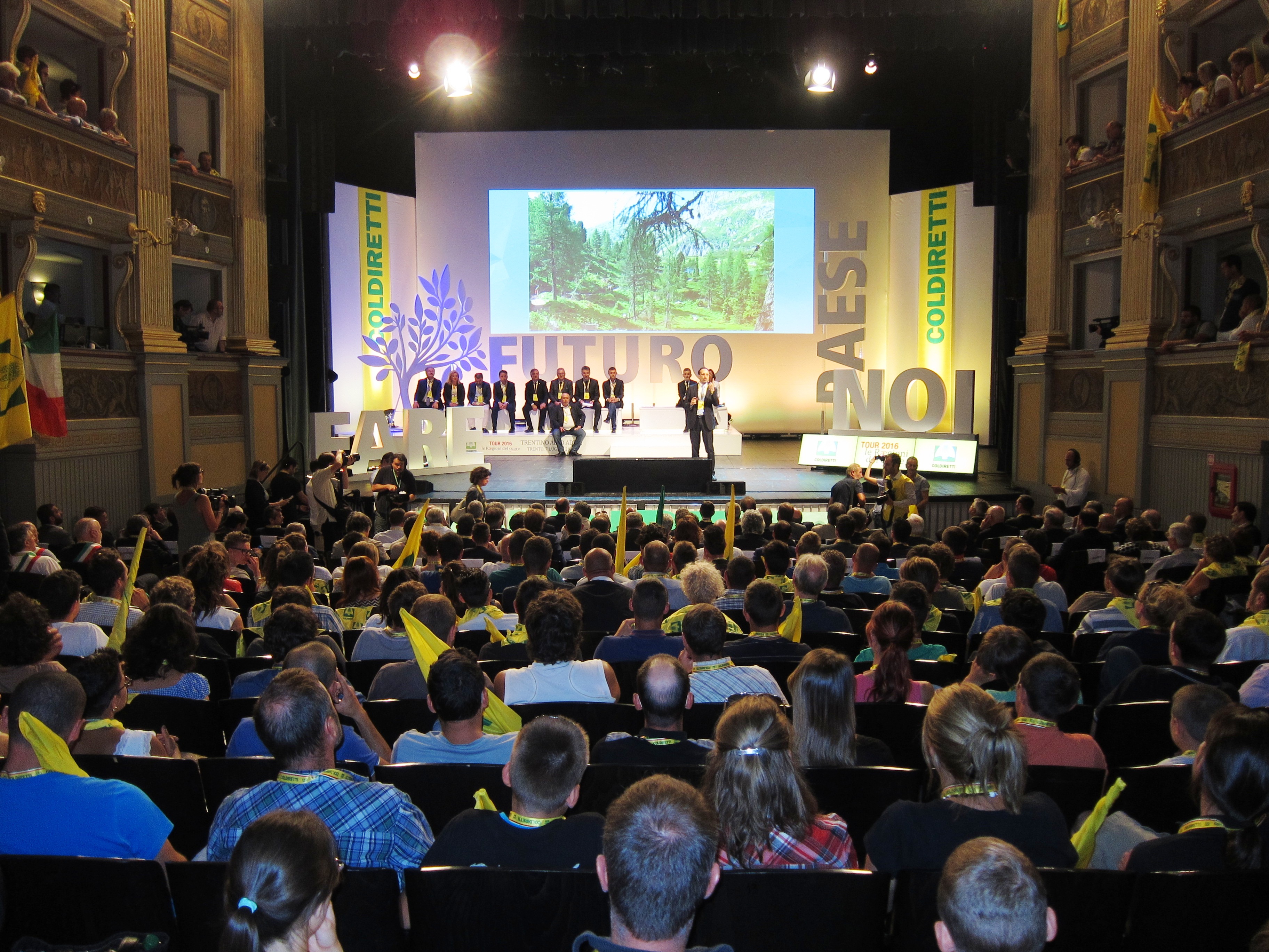 Sul palco del Teatro Sociale è andato in scena un confronto a tre fra il presidente della Provincia autonoma di Trento Ugo Rossi, il ministro dell’Ambiente Gianluca Galletti e il viceministro delle politiche agricole, alimentari e forestali Andrea Oliviero, intervistati dal presidente di Coldiretti Roberto Moncalvo”.