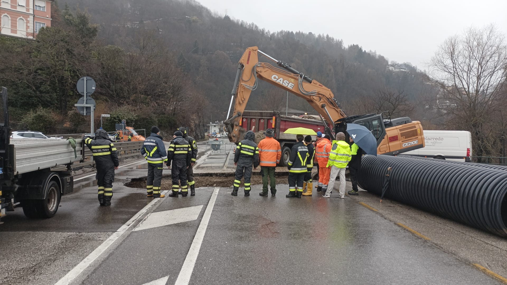 Continuano le operazioni per sostituire le tubazioni dopo il cedimento. La SS47 chiusa da Levico a Pergine Est, traffico deviato sulla SP1 di Caldonazzo