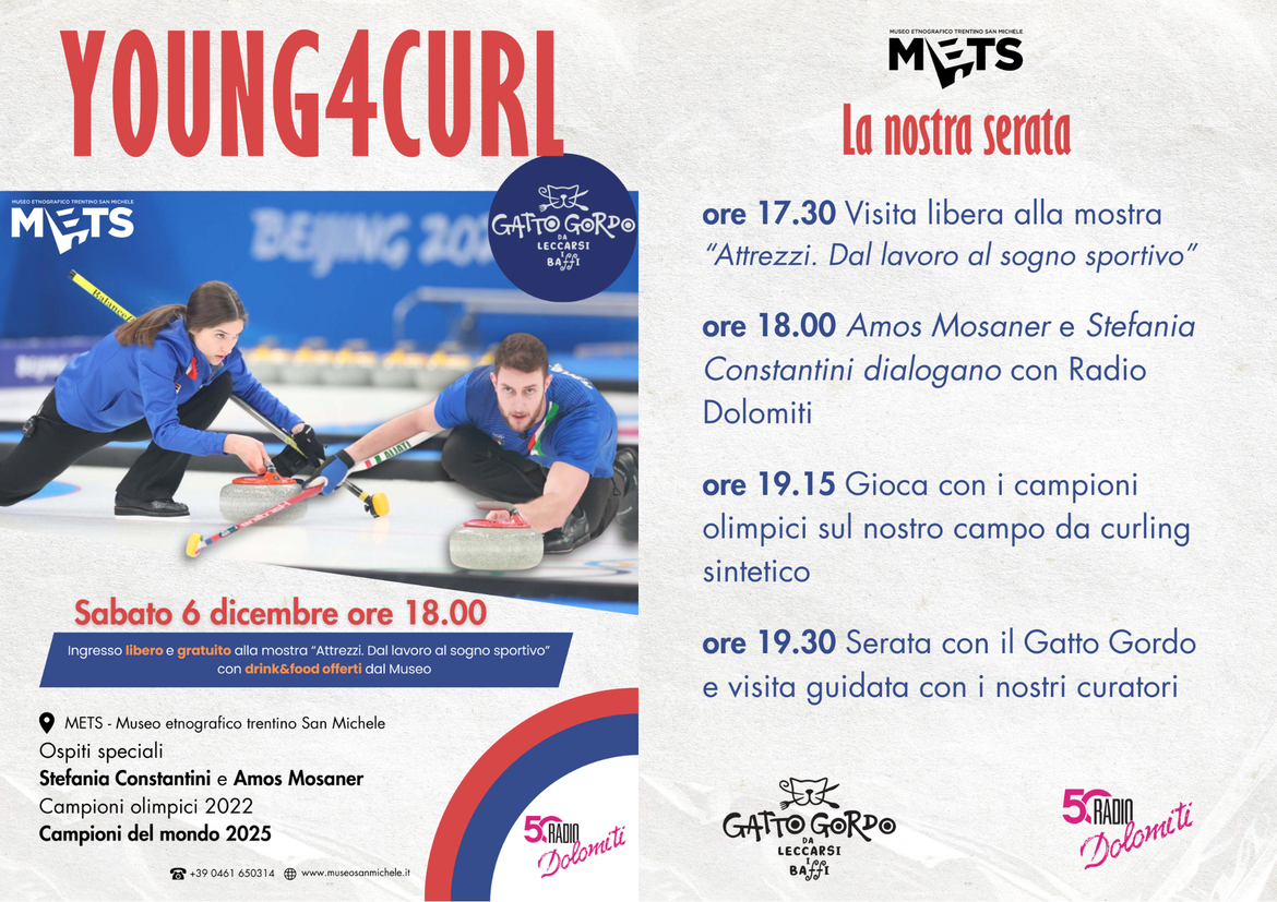 Sabato 6 dicembre il METS, con un appuntamento davvero speciale, dà il via al ricco calendario di appuntamenti culturali collegati alla mostra “Attrezzi. Dal lavoro al sogno sportivo”, visitabile dal 5 dicembre 2025 al 31 marzo 2026. Ospiti d’eccezione della serata saranno Amos Mosaner e Stefania Constantini, campioni olimpici nel doppio misto di curling a Pechino 2022 e Campioni del mondo 2025 (Fredericton, Canada) nel doppio misto, primo titolo iridato di sempre per l'Italia del curling.