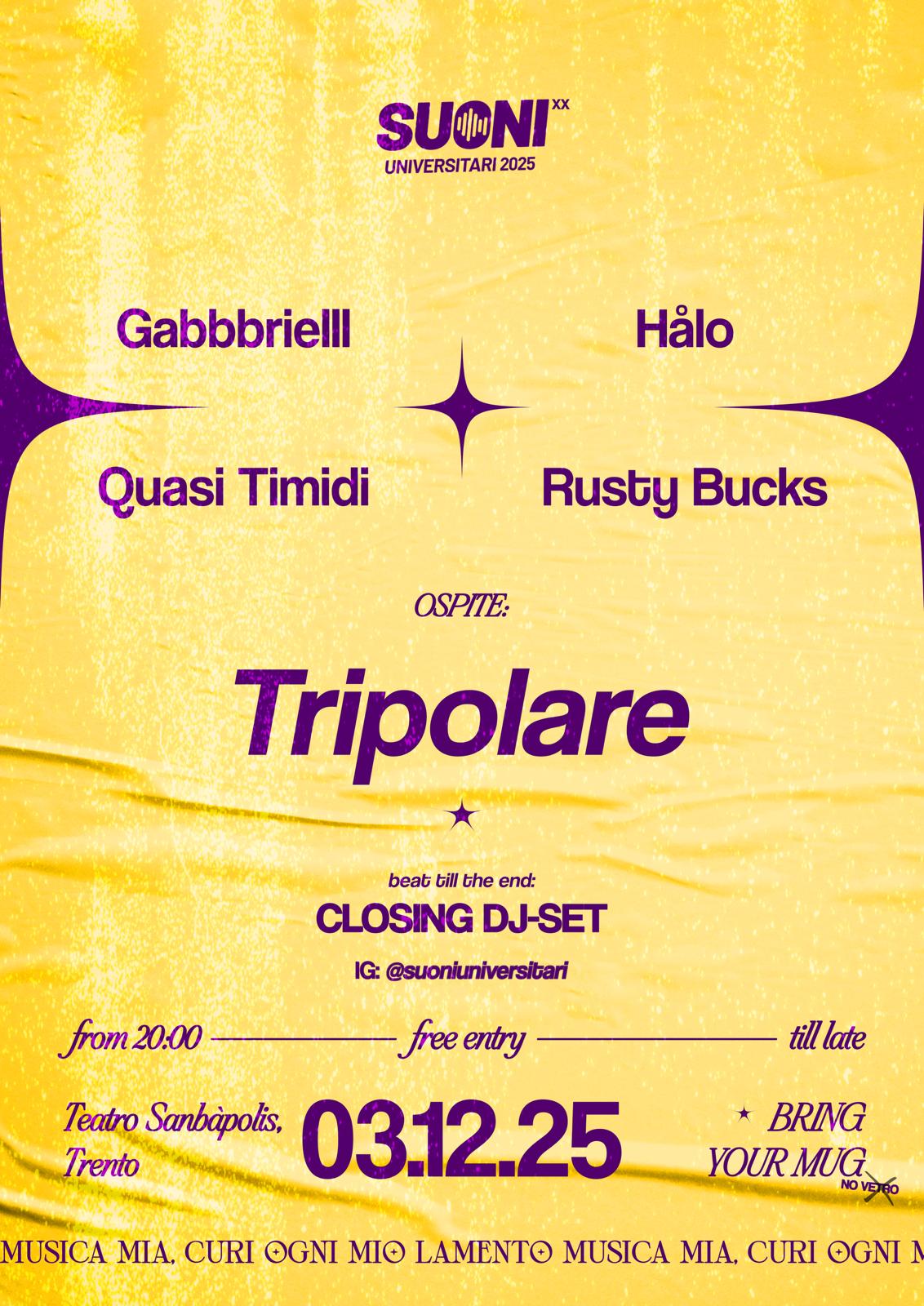 Ospite d’eccezione della serata, Tripolare. Il suo nome all’anagrafe è Gabriele Centurione, un ragazzo nato a Napoli nel 2002. Tripolare è un talento che si destreggia tra il cantautorato, la musica e la produzione. Scopre questo mondo a soli 4 anni, iniziando a suonare il violoncello, poiché suo padre è musicista. Il mondo della produzione è invece giunto più tardi, a 16 anni, facendo così della musica la sua principale forma d’espressione. I primi singoli pubblicati, divenuti famosi, sono “Coccinelle nere” e “Il mio cane”, entrambi del 2022, a cui ha fatto seguito anche il primo EP “PANORAMA20”. A maggio 2025 calca il palco del primo maggio a Roma. Ha sperimentato molto passando dalla drum and bass, all’indie pop, al punk e ha testato tante pubblicazioni prima di capire il suo genere prevalente. Ecco perché il nome Tripolare, inteso come una persona che non ha le idee chiare su ciò che sta facendo ma che ci mette passione e si diverte.