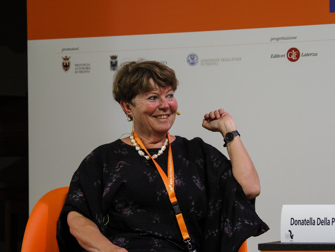 Quindi diverso tipo di globalizzazione come presa d'atto della necessità di sviluppare identità cosmopolite con una forte critica allo sviluppo economico non regolamentato della globalizzazione attuale. Il punto interrogativo resterà ma il mio non è un punto di vista del tutto pessimista perchè io credo che molti movimenti attuali pur se in maniera molto diversa, rispetto ai movimenti dei social forum globali, dei social forum europei riescono a mantenere una ricerca di un’altra globalizzazione possibile", ha sostenuto Donatella della Porta Definendo la parola globalizzazione ne ha illustrato le caratteristiche nei vari ambiti e ha parlato globalizzazione liquida e c’è soprattutto una dimensione di globalizzazione finanziaria, (con sfide delle diseguaglianze), globalizazione culturale con una omogeneizzazione liquida (Bauman) e, soprattutto, una globalizzazione politica, "perchè, sempre di più, le decisioni sfuggono agli Stati nazionali e infatti nazionalizzazione e globalizzazione che sono due dei temi centrali del Festival dell'economia di quest'anno vengono a confliggere con il tema, importante per la democrazia che è quello della rappresentanza. In tutto questo quale è lo spazio per pensare, riflettere elaborare, dare gambe e costruire un’altra globalizzazione capace di vincere le sfide, per esempio, delle diseguaglianza e ad un 'back legs' cioè un passaggio dalle speranze nel cosmopolitismo e nel progresso ad un ritorno indietro verso valori più conservatori e ad una forte crisi di legittimità politica che abbiamo visto nei risultati delle recenti elezioni europee che sono stati molto eterogenei, nei diversi paesi ma che quasi dappertutto hanno visto un crollo delle forze politiche che negli ultimi cinquant'anni avevano costruito dei sistemi di partito molto stabili. E, un altro modo è possibile?". Se lo è posto Donatella Della Porta e, in modo molto dettagliato, ha parlato di sfide, di opportunità, di identità cosmopolite, fra gli elementi che concorrano a sviluppare una concezione di globalizzazione alternativa.