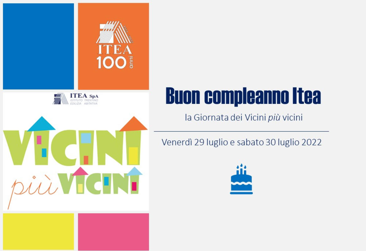 La storia di Itea, il sodalizio con la comunità trentina e con le famiglie che oggi abitano in una casa Itea sono e saranno gli attori principali dei tanti eventi in programma nel corso dell’intero anno quali: “100 sopralluoghi per i cento anni”, “100 alberi per 100 bambini” nati nel 2022 nelle famiglie Itea, “Itea al Mart con Luigi Senesi”, “Ti raccontiamo Itea”, quattro Concorsi rivolti agli inquilini, ai più giovani e agli studenti delle scuole secondarie di secondo grado provinciali con indirizzo arte, grafica e design e, infine, le due giornate, venerdì 29 e sabato 30 luglio, dedicate alla “Giornata dei Vicini più vicini”. Quest’ultima iniziativa, centrata sui rapporti di buon vicinato, è promossa da Itea Spa per favorire una serena convivenza nei complessi di edilizia residenziale pubblica e l’edizione di quest'anno è stata dedicata ai 100 anni di attività di Itea che, simbolicamente, spegnerà le candeline di questo compleanno speciale insieme agli inquilini, alle realtà e alle associazioni che vi hanno aderito, augurandole buon compleanno!