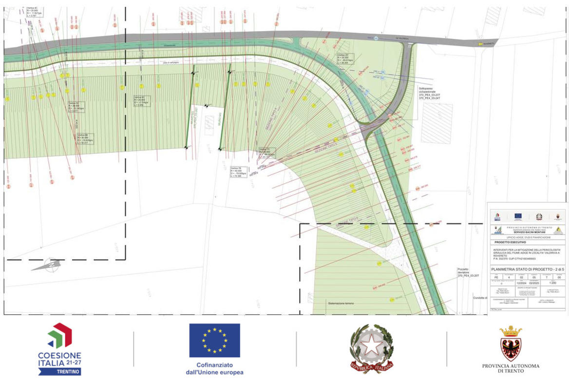 Il progetto prevede inoltre un importante lavoro di inserimento paesaggistico, con un raccordo coltivabile verso la campagna per armonizzare l’opera con il contesto agricolo circostante. Contestualmente sarà riqualificata la pista ciclopedonale che oggi interferisce con via Valdiriva, saranno gestiti gli importanti scarichi delle acque bianche provenienti dalla città di Rovereto migliorando la qualità delle acque prima di farle confluire nel fiume Adige e sarà effettuata la bonifica da eventuali residuati bellici delle superfici interessate.