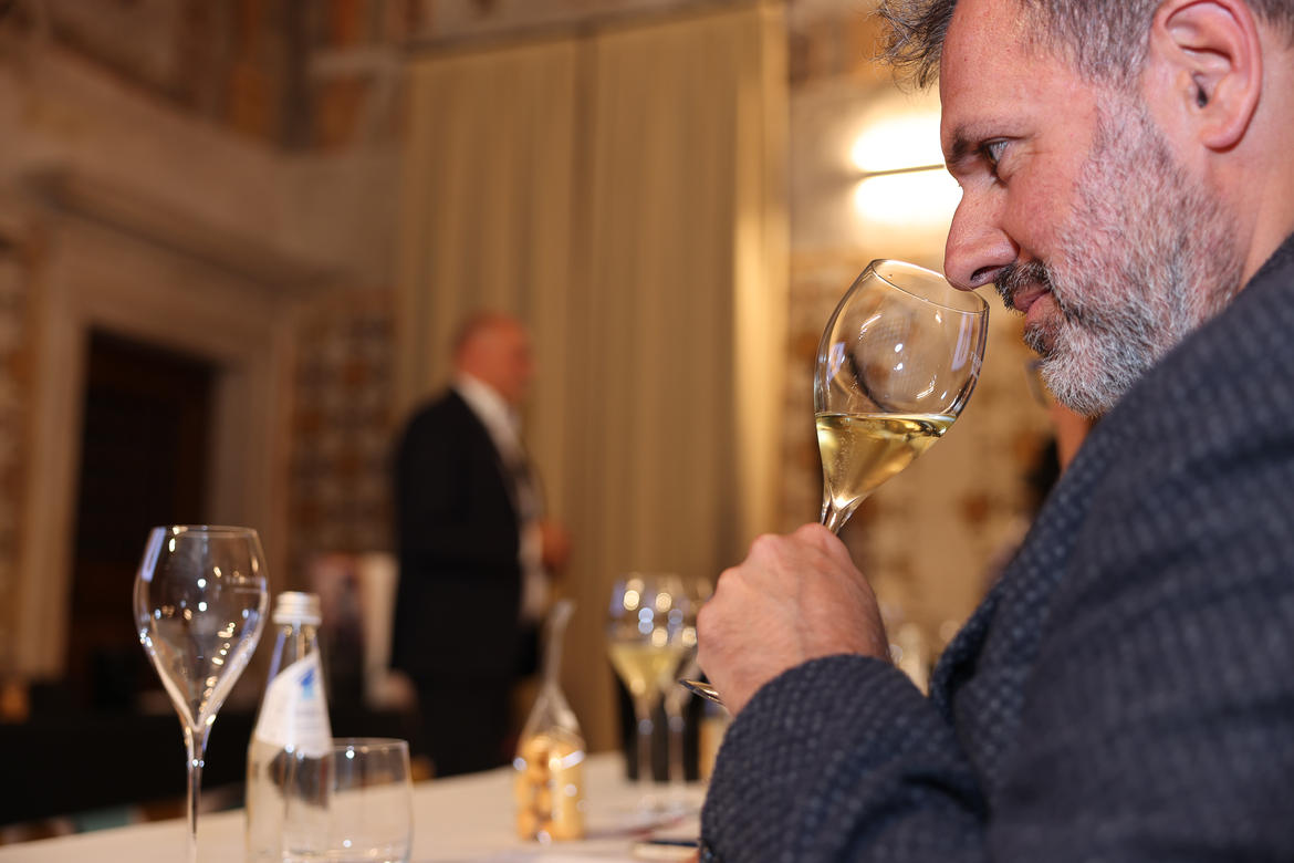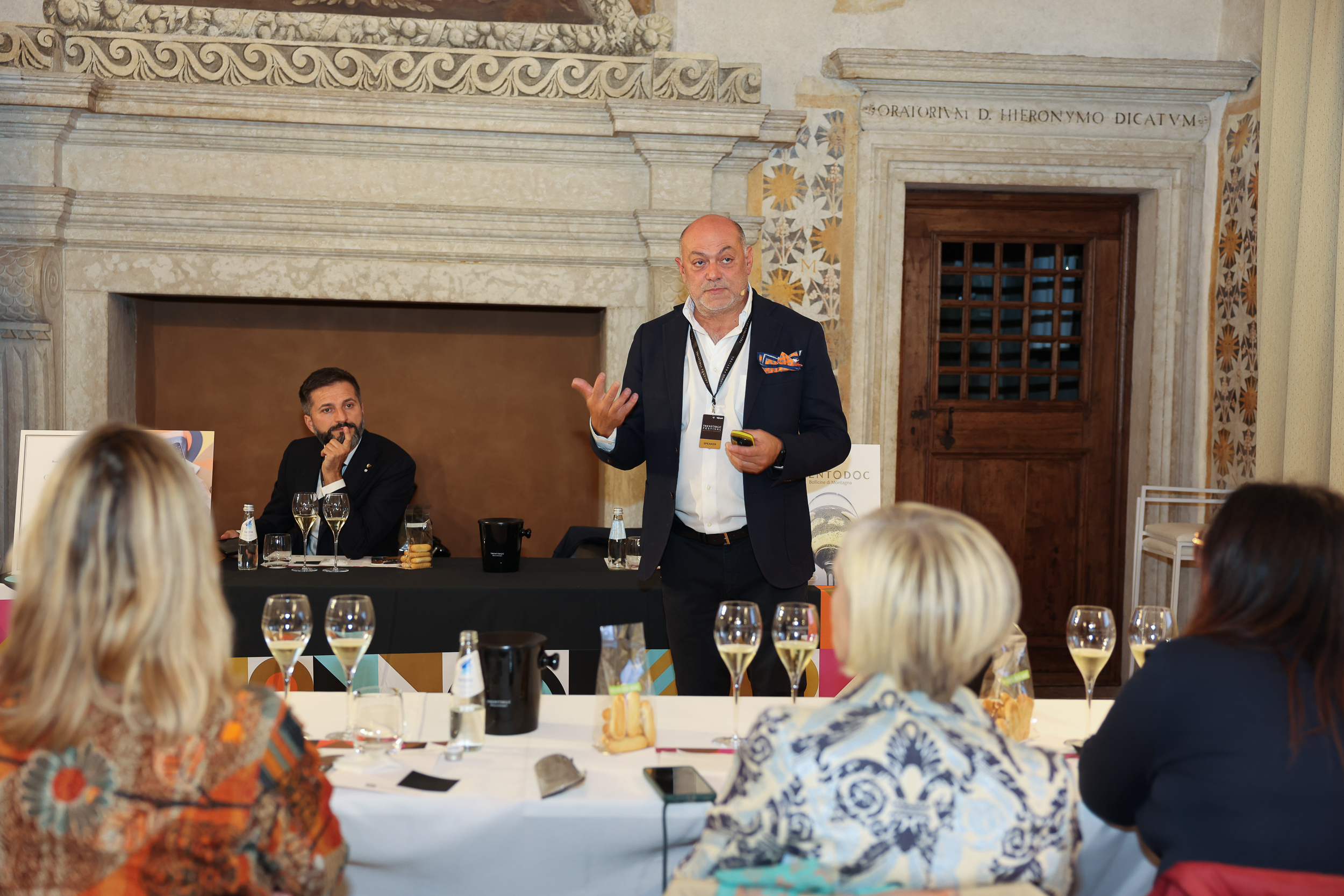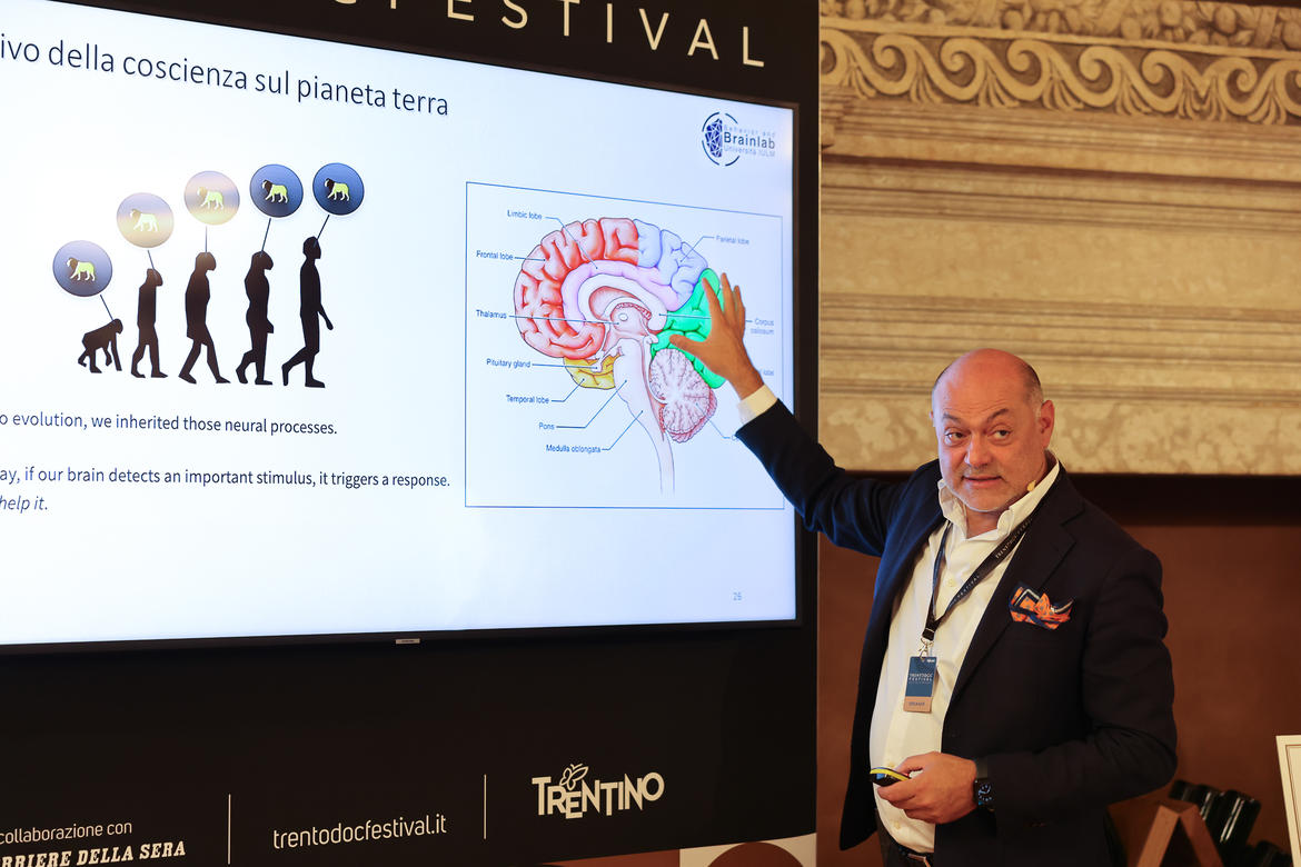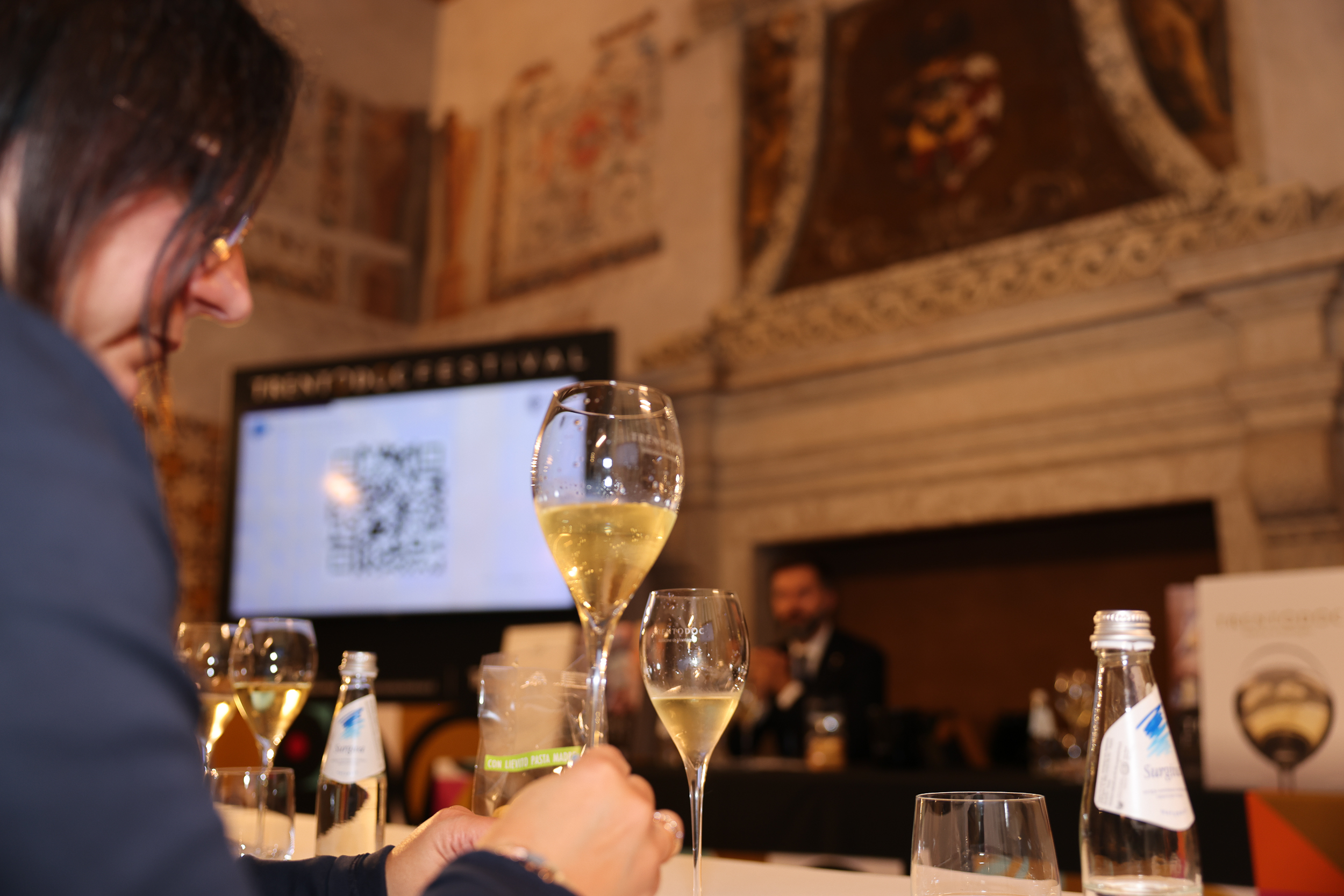 Simone Loguercio, nominato miglior sommelier nel 2018, e Vincenzo Russo, professore di Psicologia dei consumi e neuromarketing allo Iulm, nelle sale di Palazzo Roccabruna hanno accompagnato il pubblico in una degustazione molto particolare, illustrando le zone del cervello che si attivano sin da quando si legge l’etichetta della bottiglia prescelta dallo scaffale e cosa ci porta a scegliere un prodotto rispetto a un altro.
