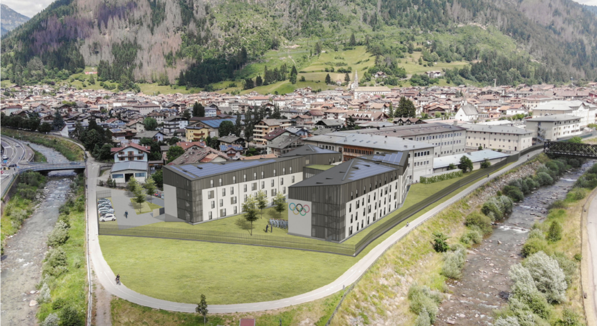 L’edificio sarà in larga parte realizzato in legno (escluse le fondazioni che saranno in cemento armato), l’unica eccezione è relativa al corpo centrale che sarà costruito con una struttura verticale in acciaio. L’impiego del legno rappresenta una scelta di grande rilievo anche da un punto di vista della sostenibilità. Capace di garantire una totale eco-compatibilità, riciclabile al 100%, si smaltisce con estrema facilità. Sulla copertura sarà installato un impianto fotovoltaico. Farà parte del villaggio olimpico anche il Padiglione Latemar: un edificio già esistente che sarà demolito e ricostruito. Come la prima costruzione, anche quest’ultima avrà un impianto fotovoltaico sulla copertura.