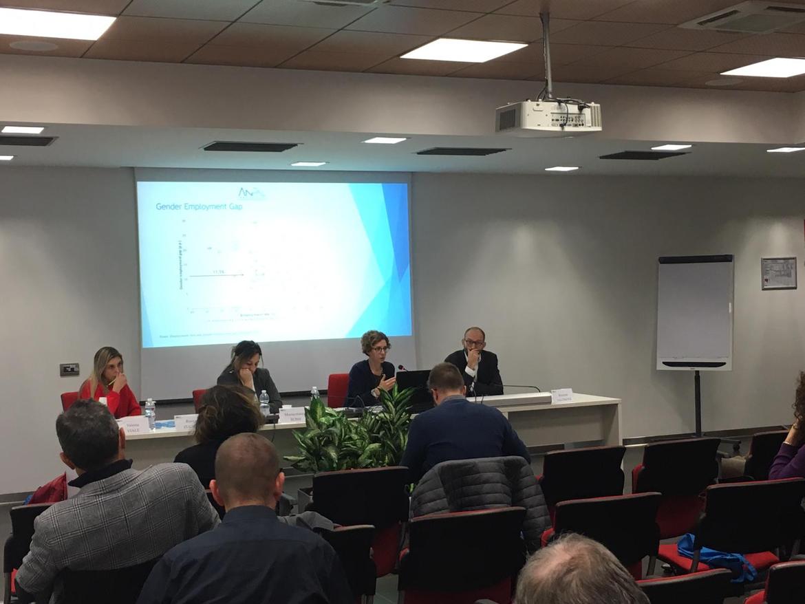 Trento, 4 dicembre 2018 – Dopo il saluto di benvenuto di Riccardo Salomone, direttore dell'Agenzia del Lavoro di Trento, ha preso la parola Valeria Viale, ricercatrice dell'Agenzia nazionale per le Politiche attive del Lavoro, che ha illustrato al pubblico alcuni dati statistici sul tema della conciliazione in Europa: "Vorrei presentare i primi risultati dell'analisi qualitativa che abbiamo concluso recentemente usando due indicatori: il 1° è il tasso di occupazione (Italia al 62% e quello soddisfacente per l'UE è il 78%); il 2° indicatore è il gap nel lavoro da un punto di vista delle differenze di genere: in Europa nel 2015 il valore desiderato era l'11% e i dati registrati sono stati al primo posto la Finlandia con il 2%; ultime Italia al 20% e Malta al 27%. Abbiamo quindi analizzato questi dati: al diminuire del gap crescono i tassi di occupazione delle donne.