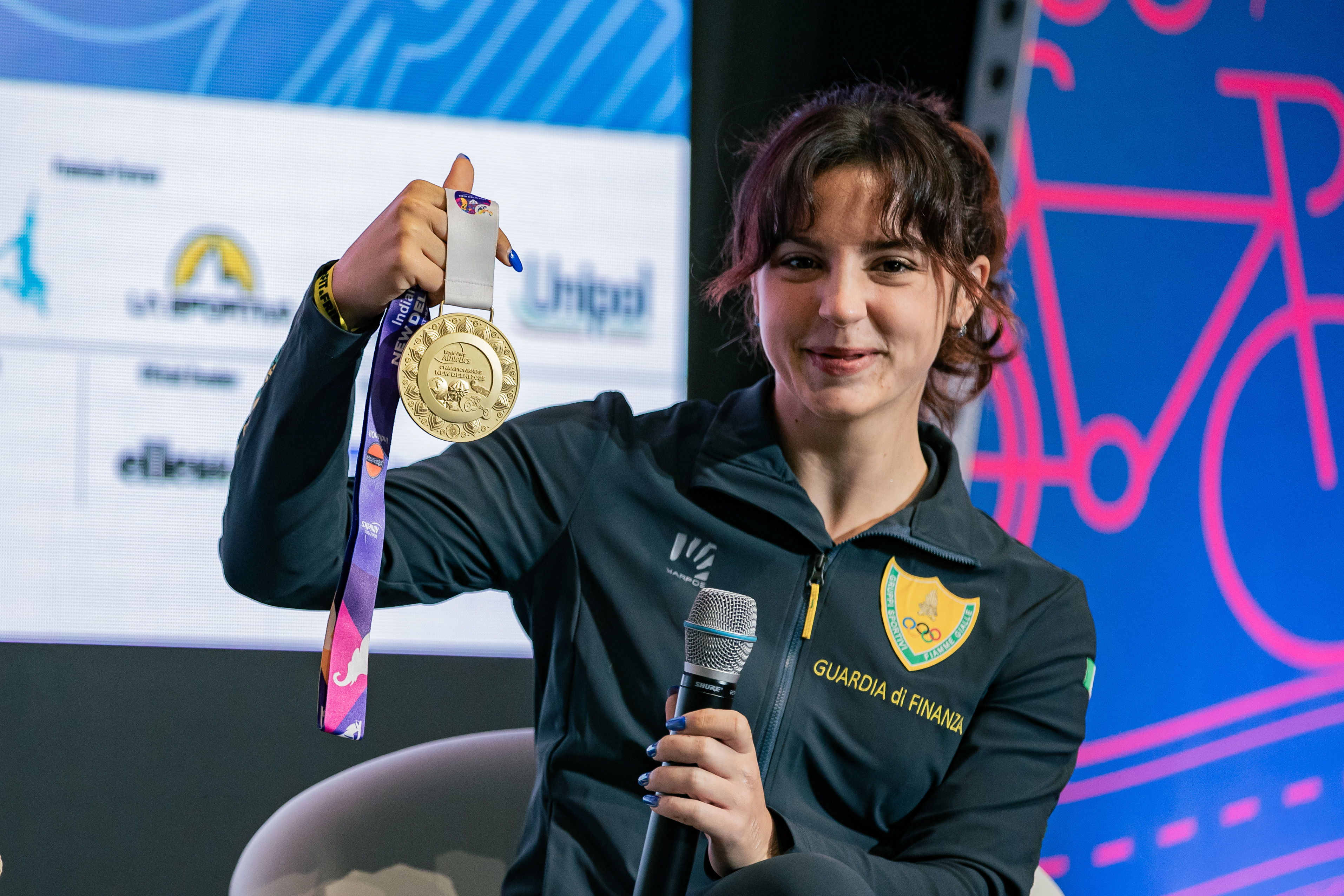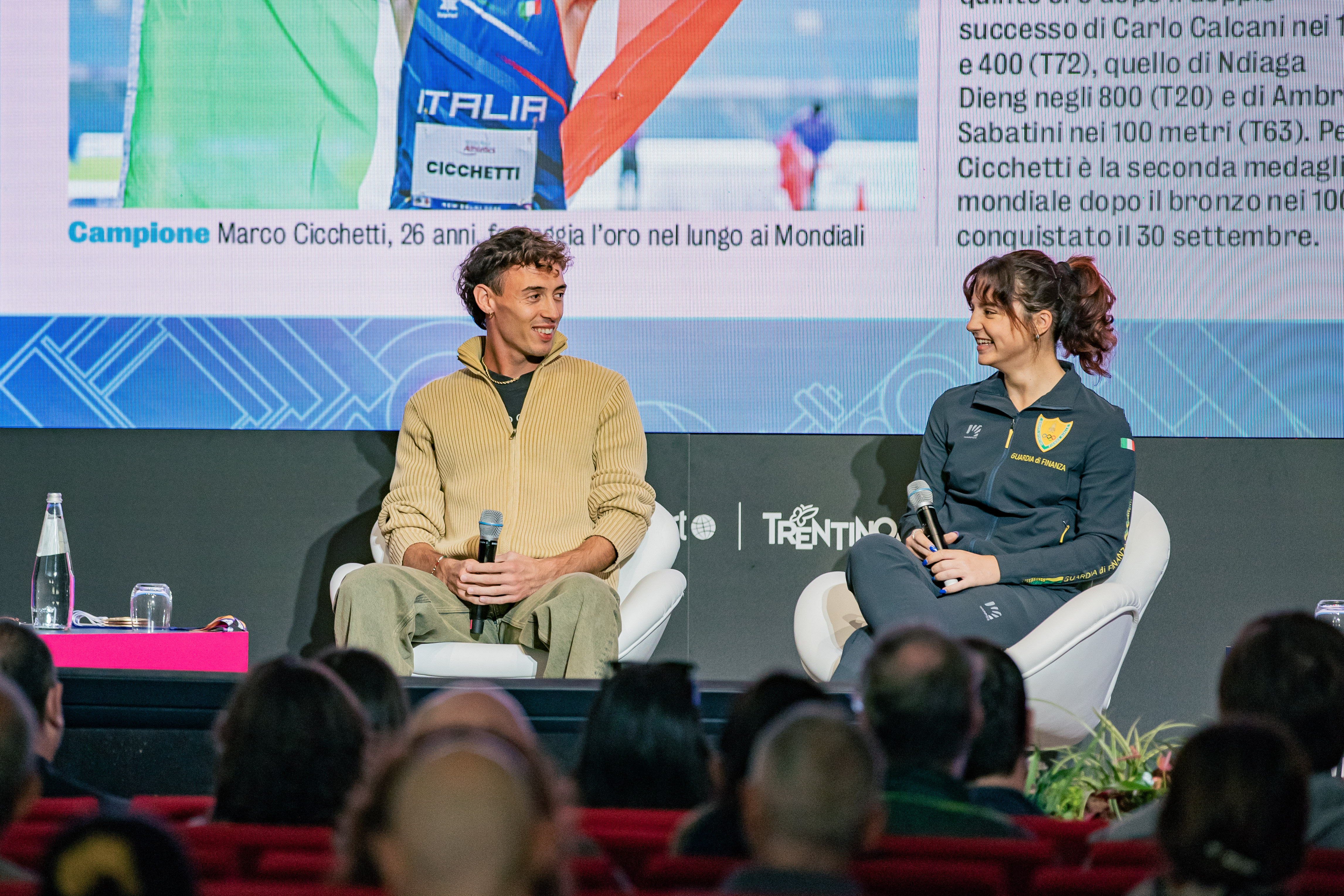Al Festival dello Sport di Trento le due stelle azzurre, accolte da un lunghissimo applauso, hanno mostrato orgogliosamente al pubblico le medaglie conquistate, ma hanno portato soprattutto le emozioni dell’avventura Mondiale: il desiderio di riscatto di Ambra Sabatini dopo la caduta ai Giochi di Parigi a pochi metri dal traguardo e la voglia di superarsi di Marco Cicchetti, che nella conquista del triplo podio ha stabilito ogni volta il nuovo record europeo.